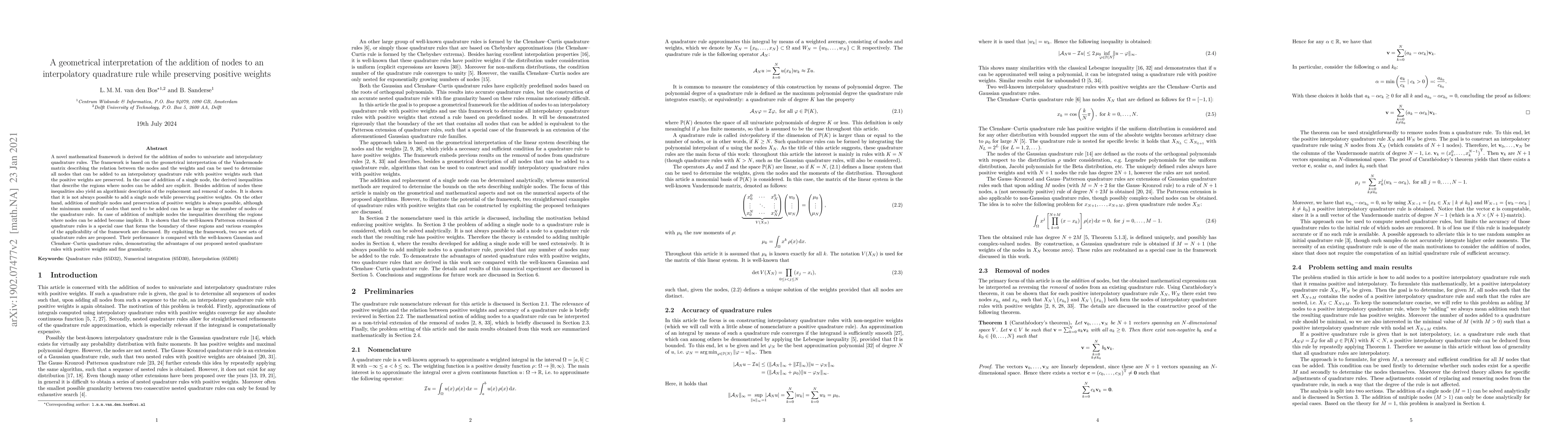 This paper introduces a geometric approach to add nodes to an interpolatory quadrature rule while preserving positive weights. It derives inequalities for node addition, replacement, and removal, showing that while adding a single node may not always preserve positivity, multiple nodes can always be added. The framework also proposes new nested quadrature rules with positive weights, which outperform Gaussian and Clenshaw-Curtis rules.