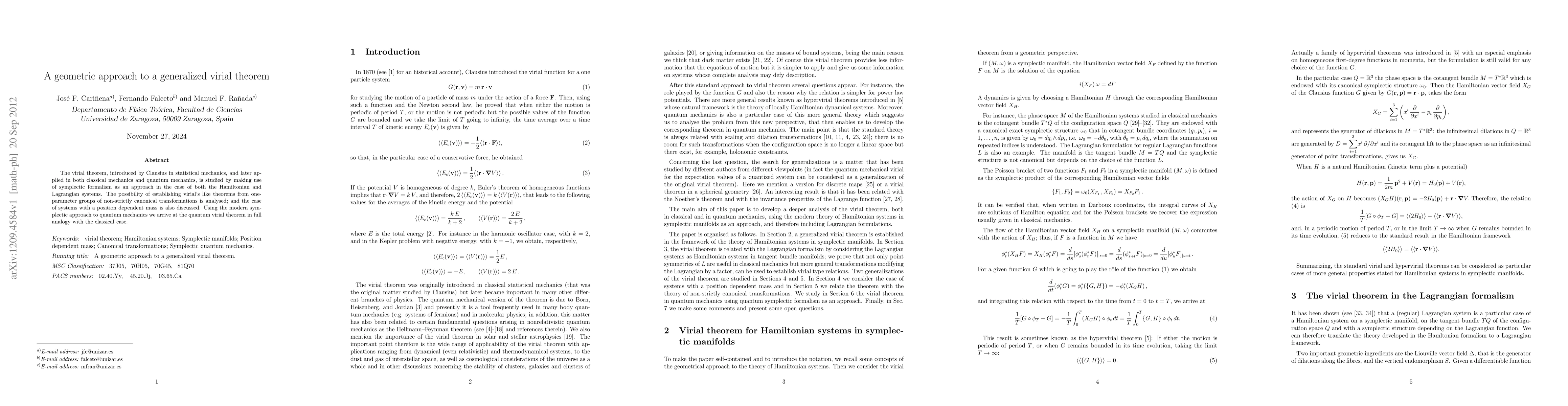 The virial theorem, introduced by Clausius in statistical mechanics, and later applied in both classical mechanics and quantum mechanics, is studied by making use of symplectic formalism as an approach in the case of both the Hamiltonian and Lagrangian systems. The possibility of establishing virial's like theorems from one-parameter groups of non-strictly canonical transformations is analysed; and the case of systems with a position dependent mass is also discussed. Using the modern symplectic approach to quantum mechanics we arrive at the quantum virial theorem in full analogy with the classical case.