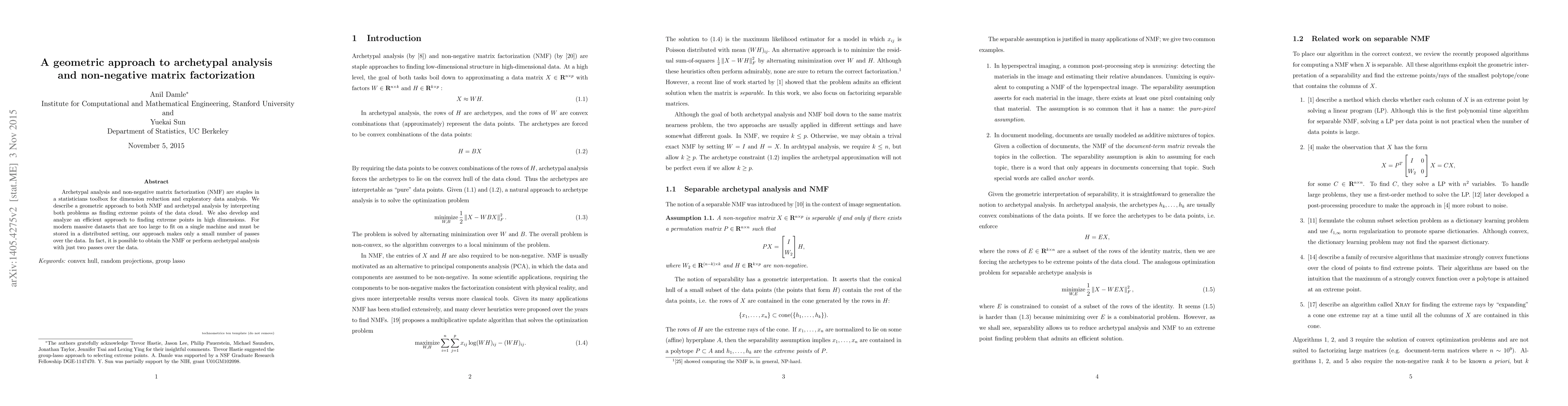 This paper presents a geometric approach to archetypal analysis and non-negative matrix factorization (NMF), interpreting both as finding extreme points of data clouds. It develops an efficient method for high-dimensional data, requiring only two passes over massive, distributed datasets for NMF or archetypal analysis.