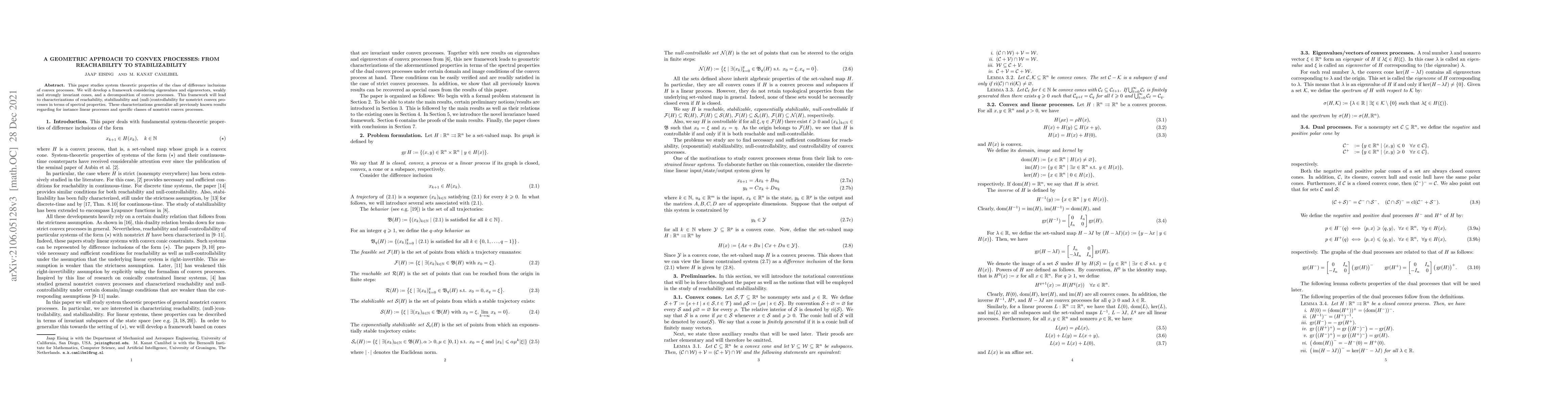 This paper develops a geometric framework for analyzing convex processes, utilizing eigenvalues and cones to characterize reachability, stabilizability, and controllability, thereby generalizing existing results for linear and specific classes of nonstrict convex processes.