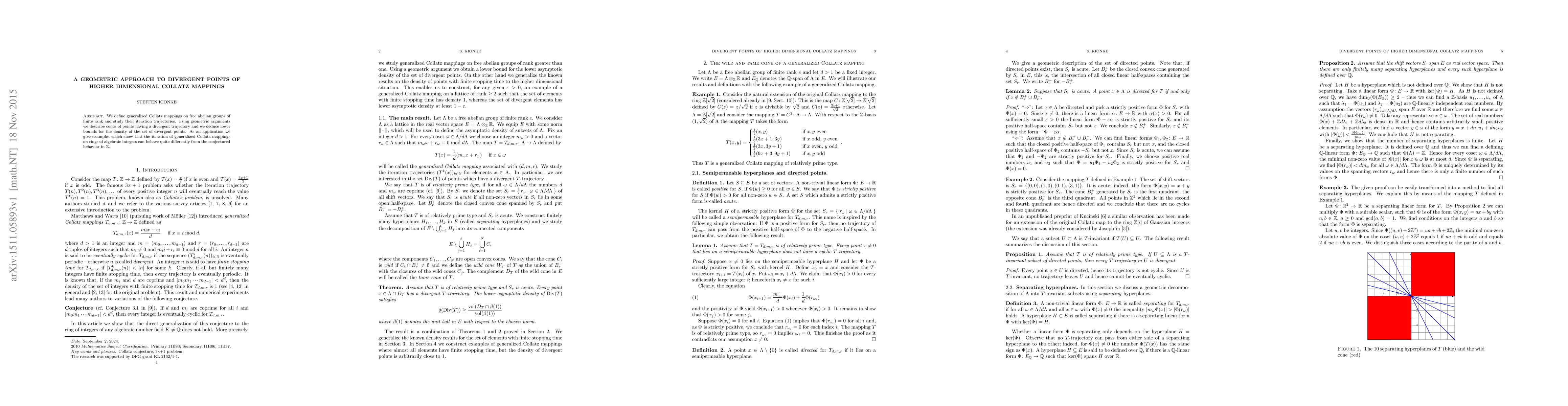 We define generalized Collatz mappings on free abelian groups of finite rank and study their iteration trajectories. Using geometric arguments we describe cones of points having a divergent trajectory and we deduce lower bounds for the density of the set of divergent points. As an application we give examples which show that the iteration of generalized Collatz mappings on rings of algebraic integers can behave quite differently from the conjectured behavior in $Z$.