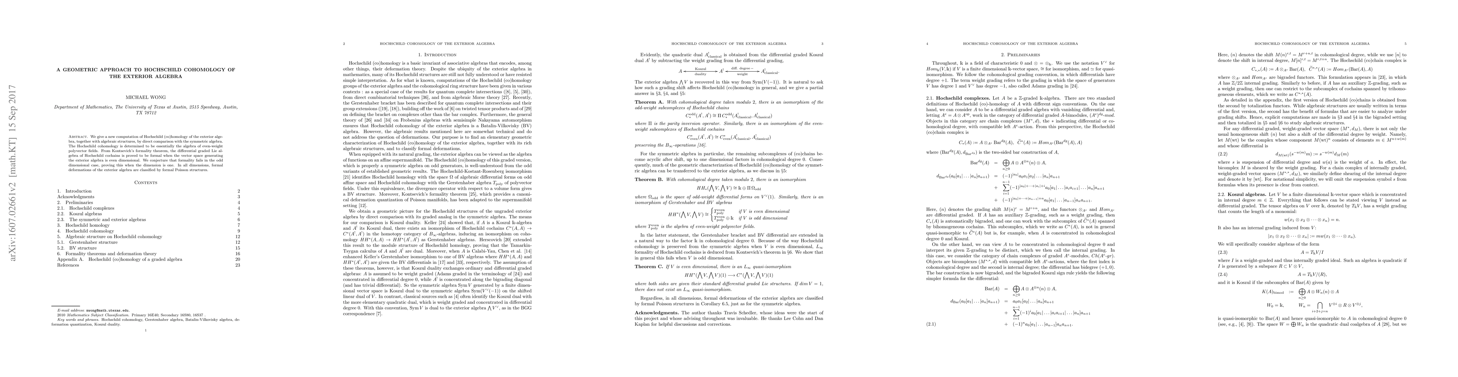 This paper computes the Hochschild cohomology of the exterior algebra geometrically, showing it corresponds to the algebra of even-weight polyvector fields. It confirms the formality of the differential graded Lie algebra of Hochschild cochains for even-dimensional generating vector spaces and disproves it for dimension one in odd cases, classifying formal deformations by formal Poisson structures in all dimensions.