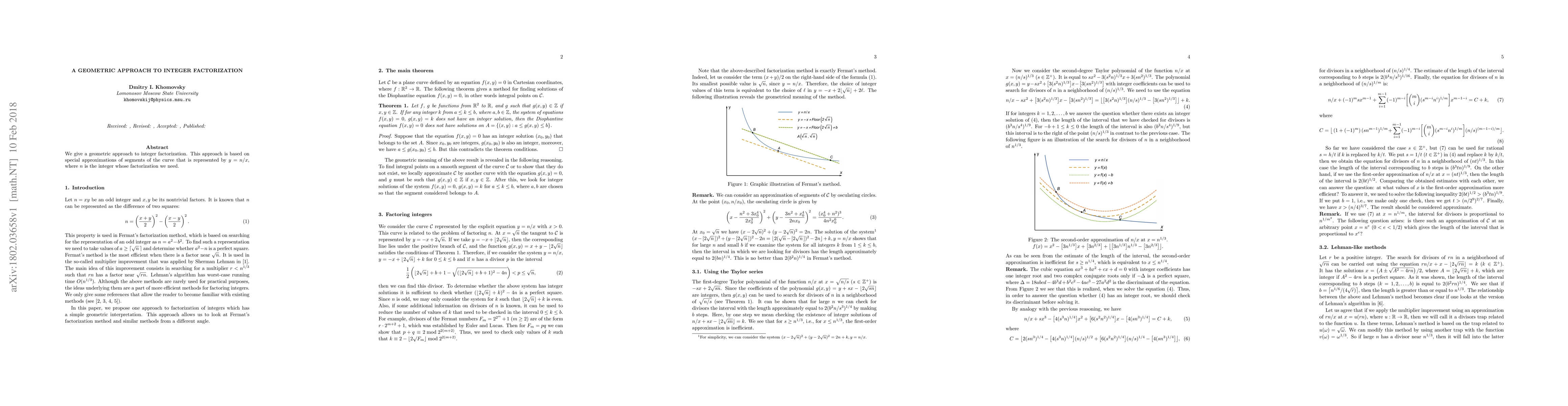 The paper presents a geometric approach to integer factorization based on approximations of segments of the curve represented by y = n/x, utilizing Diophantine equations and Taylor series approximations.