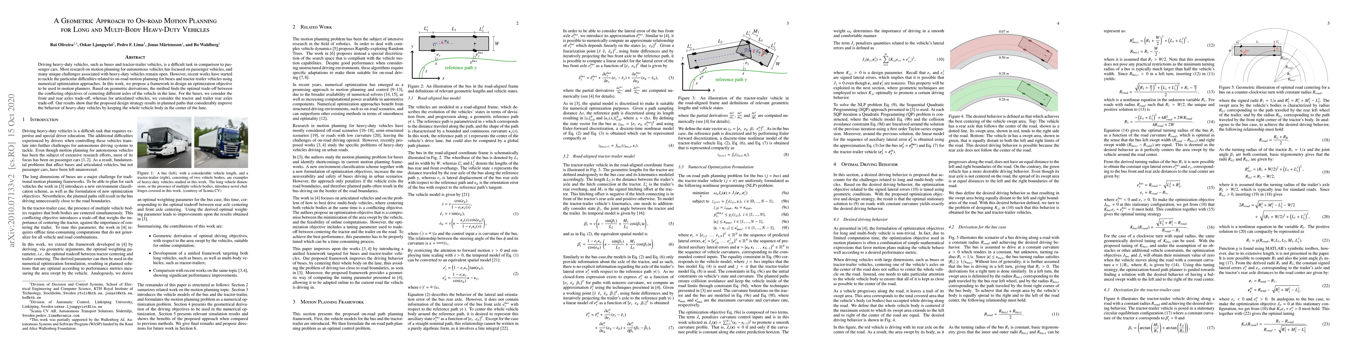 This paper proposes a geometric optimization framework for on-road motion planning of long and multi-body heavy-duty vehicles, addressing the unique challenges of centering different axles in the lane. The method significantly improves vehicle behavior by generating paths that keep the entire vehicle in the lane center.
