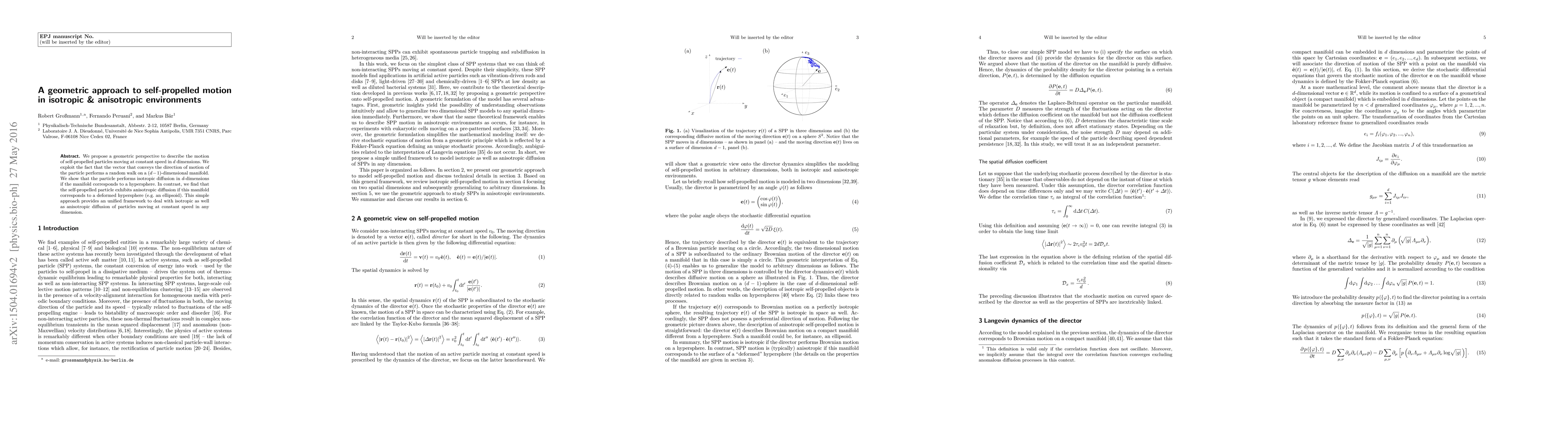 This paper introduces a geometric framework to analyze self-propelled particles' motion in various environments, showing isotropic diffusion in hyperspherical manifolds and anisotropic diffusion in deformed hyperspheres like ellipsoids. The approach unifies the understanding of diffusion in both isotropic and anisotropic settings.