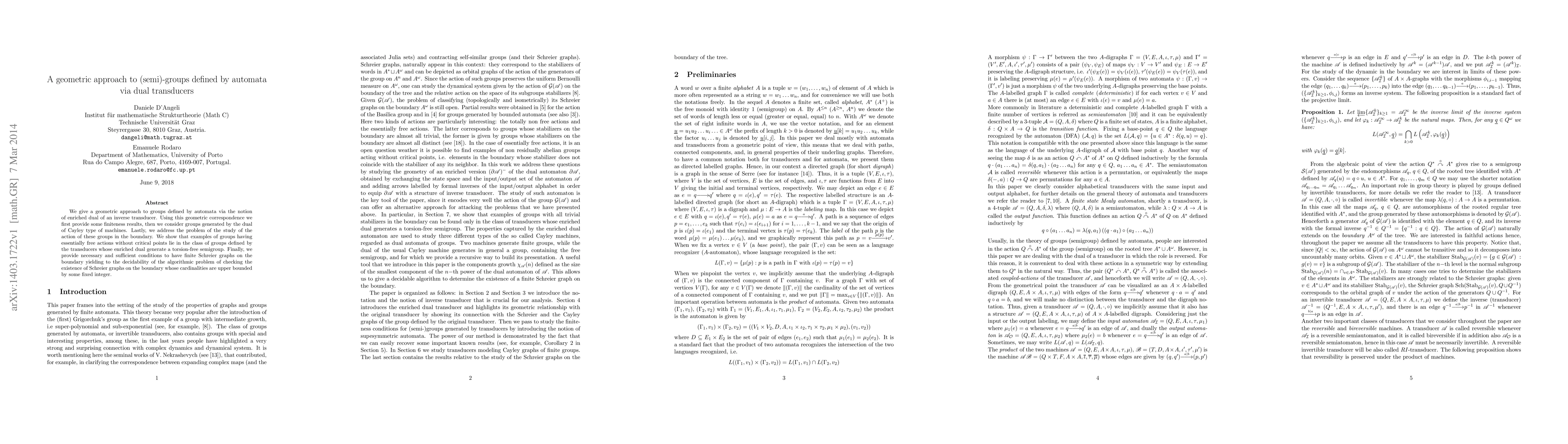 This paper presents a geometric approach to groups defined by automata through enriched duals of inverse transducers. It explores finiteness results, groups generated by dual Cayley machines, and the action of these groups on boundaries, concluding with necessary and sufficient conditions for finite Schreier graphs on boundaries, thus addressing decidability of related algorithmic problems.
