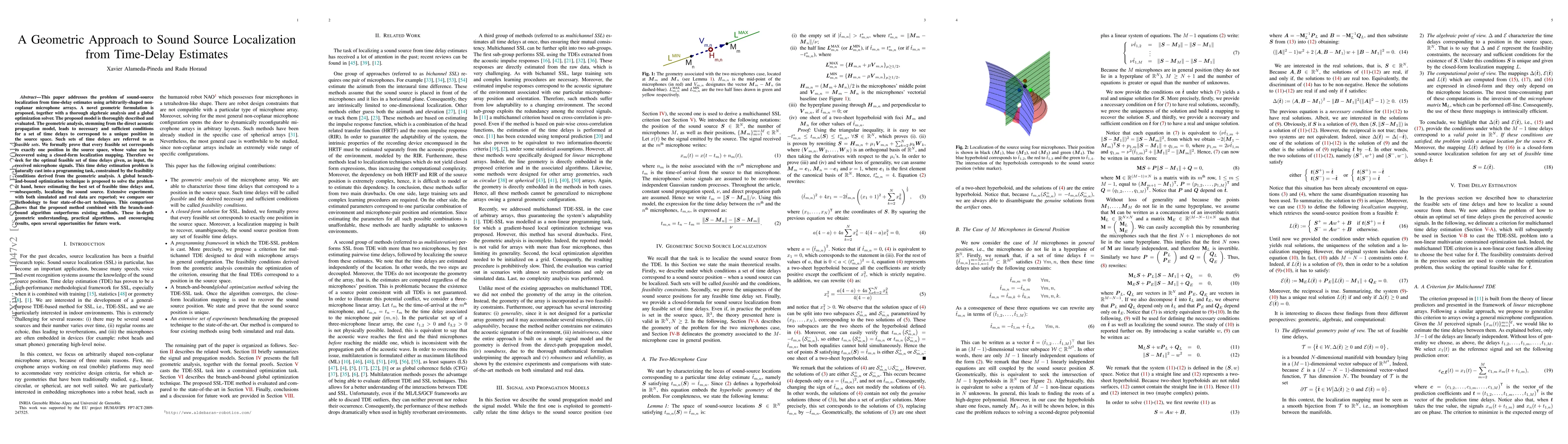 This paper addresses the problem of sound-source localization from time-delay estimates using arbitrarily-shaped non-coplanar microphone arrays. A novel geometric formulation is proposed, together with a thorough algebraic analysis and a global optimization solver. The proposed model is thoroughly described and evaluated. The geometric analysis, stemming from the direct acoustic propagation model, leads to necessary and sufficient conditions for a set of time delays to correspond to a unique position in the source space. Such sets of time delays are referred to as feasible sets. We formally prove that every feasible set corresponds to exactly one position in the source space, whose value can be recovered using a closed-form localization mapping. Therefore we seek for the optimal feasible set of time delays given, as input, the received microphone signals. This time delay estimation problem is naturally cast into a programming task, constrained by the feasibility conditions derived from the geometric analysis. A global branch-and-bound optimization technique is proposed to solve the problem at hand, hence estimating the best set of feasible time delays and, subsequently, localizing the sound source. Extensive experiments with both simulated and real data are reported; we compare our methodology to four state-of-the-art techniques. This comparison clearly shows that the proposed method combined with the branch-and-bound algorithm outperforms existing methods. These in-depth geometric understanding, practical algorithms, and encouraging results, open several opportunities for future work.