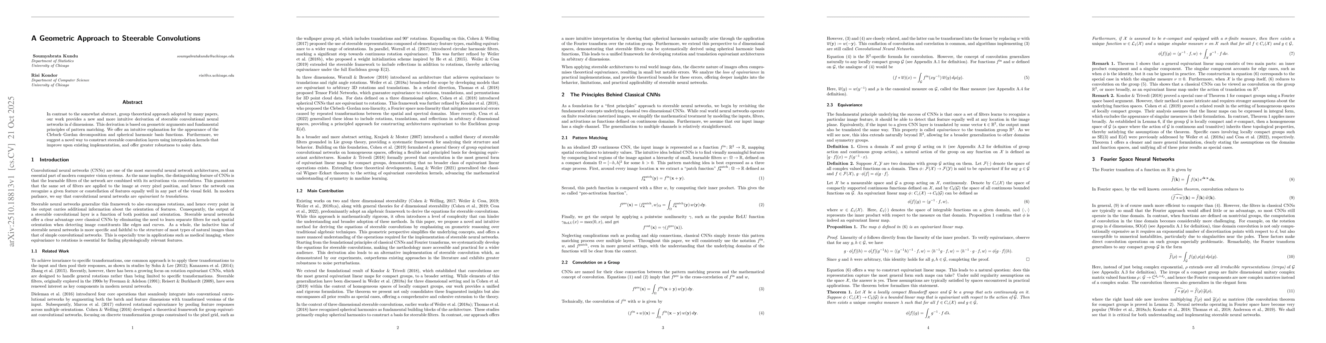 In contrast to the somewhat abstract, group theoretical approach adopted by many papers, our work provides a new and more intuitive derivation of steerable convolutional neural networks in $d$ dimensions. This derivation is based on geometric arguments and fundamental principles of pattern matching. We offer an intuitive explanation for the appearance of the Clebsch--Gordan decomposition and spherical harmonic basis functions. Furthermore, we suggest a novel way to construct steerable convolution layers using interpolation kernels that improve upon existing implementation, and offer greater robustness to noisy data.
