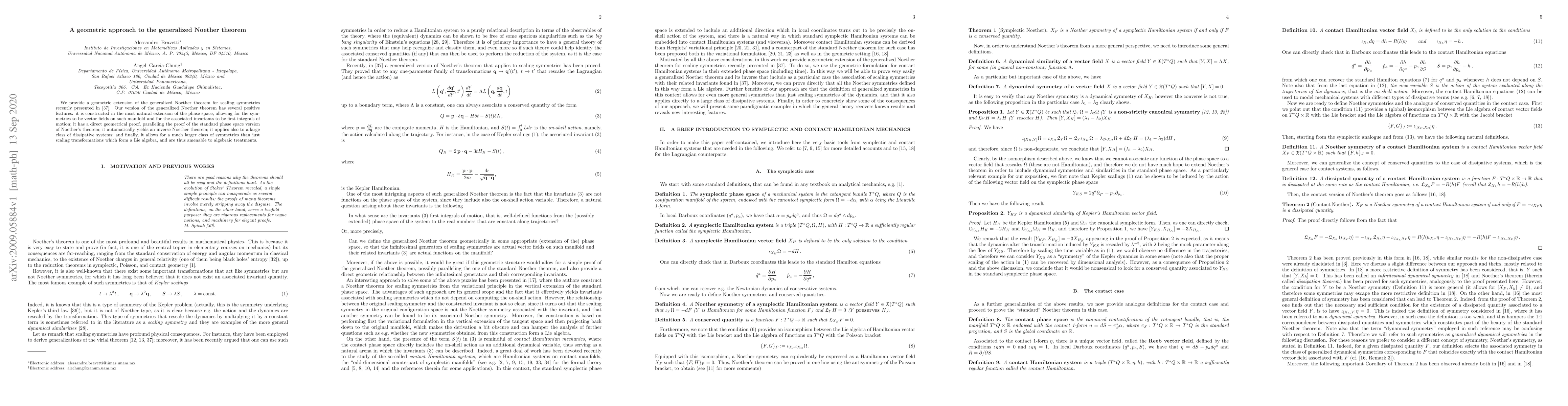 This paper extends the generalized Noether theorem to scaling symmetries with a geometric approach, offering a natural extension of phase space that accommodates vector fields and first integrals of motion, and providing a direct geometrical proof with broader applicability to dissipative systems and a wider range of symmetries beyond scaling.