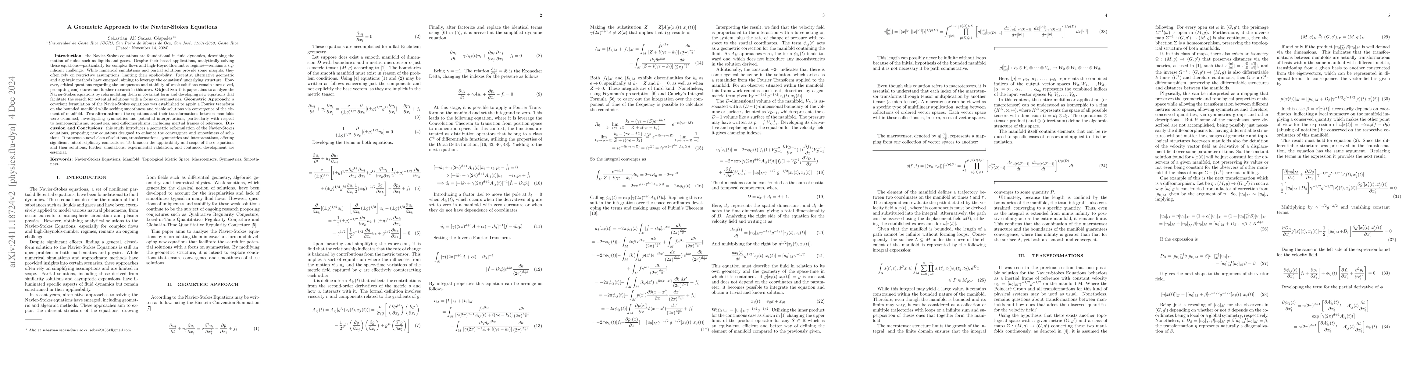Introduction: the Navier-Stokes equations are essential in fluid dynamics, describing the motion of fluids like liquids and gases. Solving these equations, especially in complex flows and high-Reynolds-number regimes, is a significant challenge. Numerical simulations provide some insights, but often under restrictive assumptions that limit applicability. Recent geometric and algebraic methods have emerged, focusing on the equations' structure, yet questions about the uniqueness and stability of weak solutions persist. Objective: this paper aims to reformulate the Navier-Stokes equations in covariant form and develop new equations that facilitate the search for potential solutions, emphasizing symmetries. Geometric Approach: a covariant formulation of the Navier-Stokes equations is presented, applying a Fourier transform on a bounded manifold and seeking smoothness and viable solutions through convergence of manifold elements. Transformations: the study examines transformations between manifolds, investigating symmetries and interpretations related to homeomorphisms, isometries, and diffeomorphisms, including inertial frames of reference. Discussion and Conclusions: this study introduces a geometric reformulation of the Navier-Stokes equations, proposing new equations to enhance convergence and smoothness of solutions. It presents a novel class of solutions and transformations, with significant interdisciplinary connections. Further simulations, experimental validation, and ongoing development are essential to broaden the applicability of these equations and their solutions.