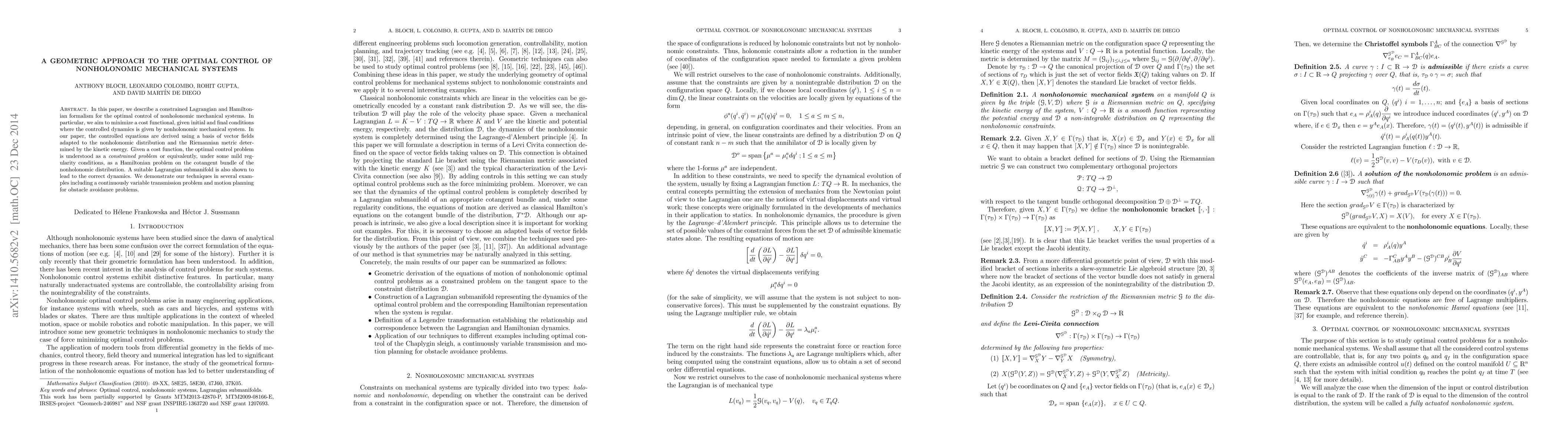 This paper presents a geometric approach to optimally control nonholonomic mechanical systems using constrained Lagrangian and Hamiltonian formalisms. The authors derive controlled equations based on vector fields and a Riemannian metric, solving the optimal control problem as a Hamiltonian problem on the cotangent bundle. Examples include applications to transmission problems and obstacle avoidance.