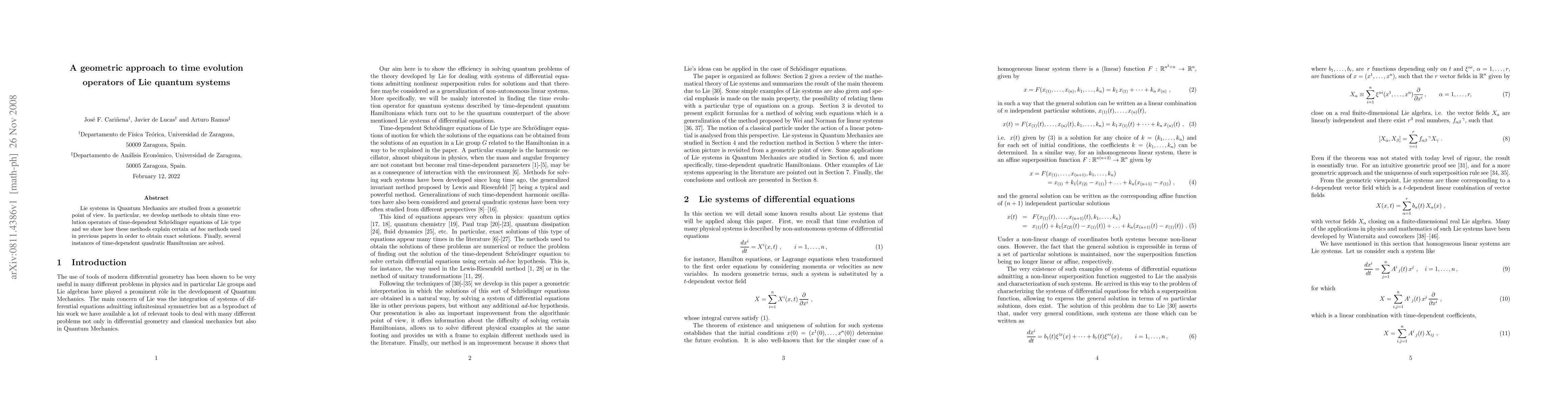 This paper presents a geometric approach to derive time evolution operators for Lie quantum systems, explaining previous ad hoc methods and solving several instances of time-dependent quadratic Hamiltonians. The study focuses on the time-dependent Schrödinger equations of Lie type.