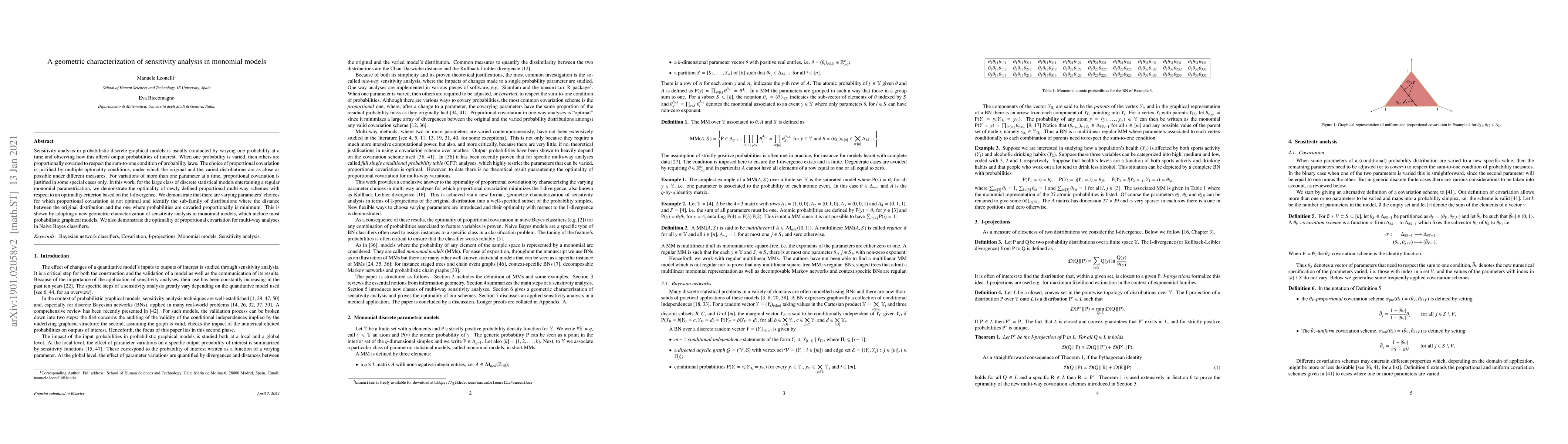 Sensitivity analysis in probabilistic discrete graphical models is usually conducted by varying one probability value at a time and observing how this affects output probabilities of interest. When one probability is varied then others are proportionally covaried to respect the sum-to-one condition of probability laws. The choice of proportional covariation is justified by a variety of optimality conditions, under which the original and the varied distributions are as close as possible under different measures of closeness. For variations of more than one parameter at a time proportional covariation is justified in some special cases only. In this work, for the large class of discrete statistical models entertaining a regular monomial parametrisation, we demonstrate the optimality of newly defined proportional multi-way schemes with respect to an optimality criterion based on the notion of I-divergence. We demonstrate that there are varying parameters choices for which proportional covariation is not optimal and identify the sub-family of model distributions where the distance between the original distribution and the one where probabilities are covaried proportionally is minimum. This is shown by adopting a new formal, geometric characterization of sensitivity analysis in monomial models, which include a wide array of probabilistic graphical models. We also demonstrate the optimality of proportional covariation for multi-way analyses in Naive Bayes classifiers.