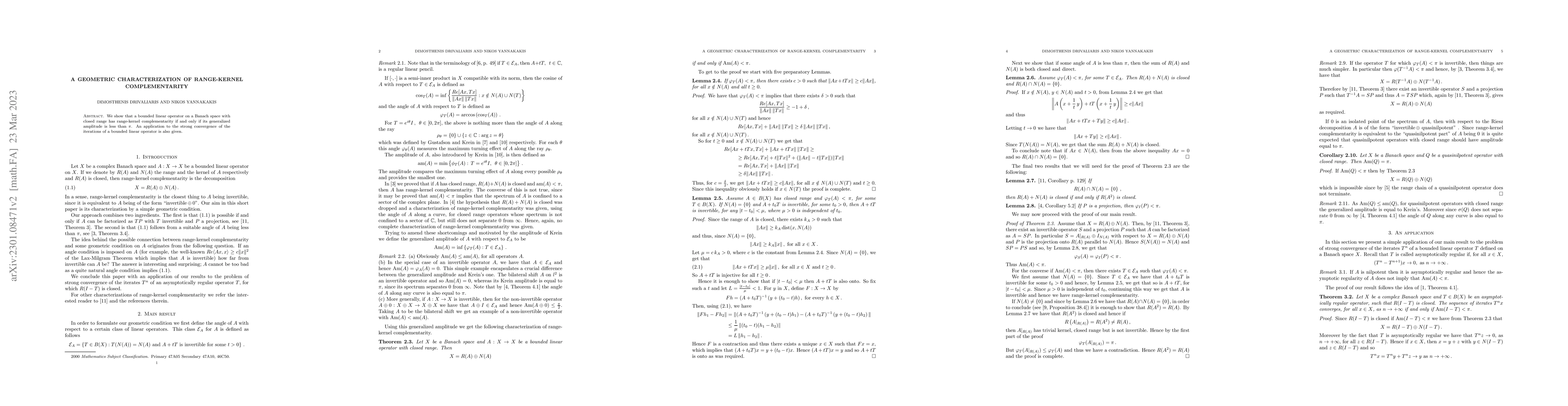 This paper establishes a geometric characterization of range-kernel complementarity for bounded linear operators on Banach spaces, proving that such complementarity holds if and only if the operator's generalized amplitude is less than $\pi$. It also provides an application to the strong convergence of operator iterations.