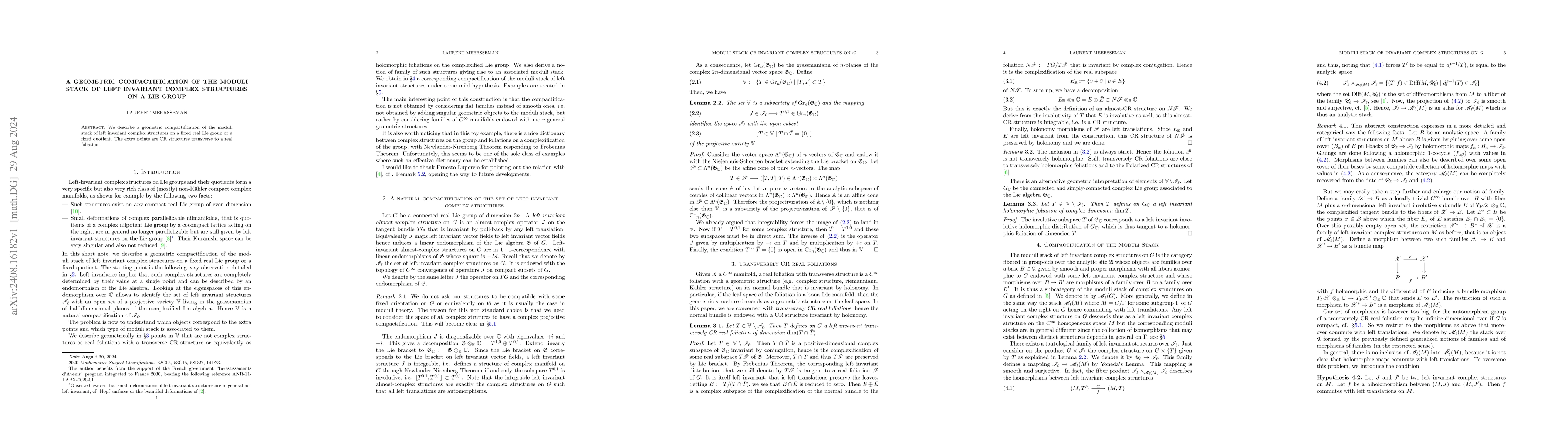 Summary: The paper presents a geometric method to compactify the moduli stack of left-invariant complex structures on a Lie group, with additional points representing CR structures that intersect a real foliation. This compactification enhances the understanding of the underlying geometry.