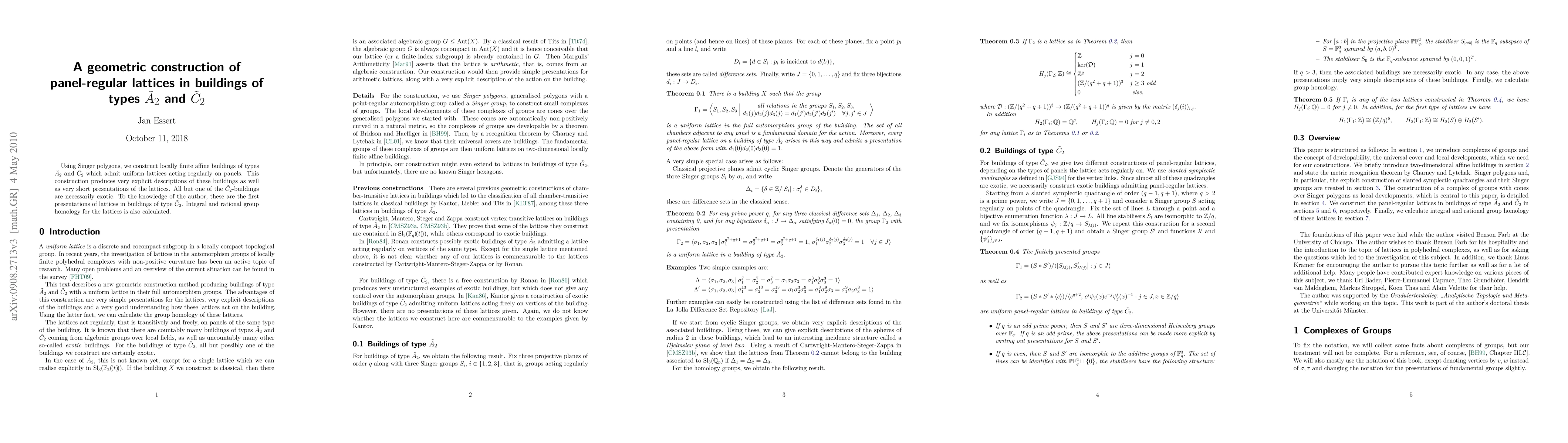 This paper constructs locally finite affine buildings of types ~A_2 and ~C_2 with uniform lattices that act regularly on panels using Singer polygons. It provides explicit descriptions and short presentations of these lattices, with most ~C_2-buildings being exotic, and calculates their integral and rational group homology.