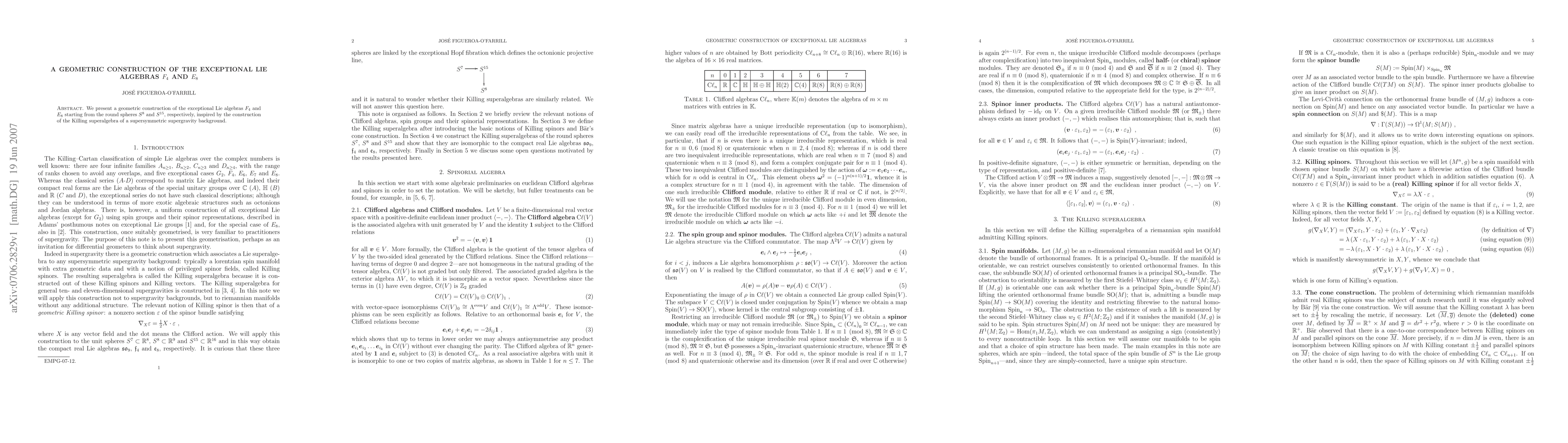 We present a geometric construction of the exceptional Lie algebras F4 and E8 starting from the round 8- and 15-spheres, respectively, inspired by the construction of the Killing superalgebra of a supersymmetric supergravity background. (There is no supergravity in the paper.)