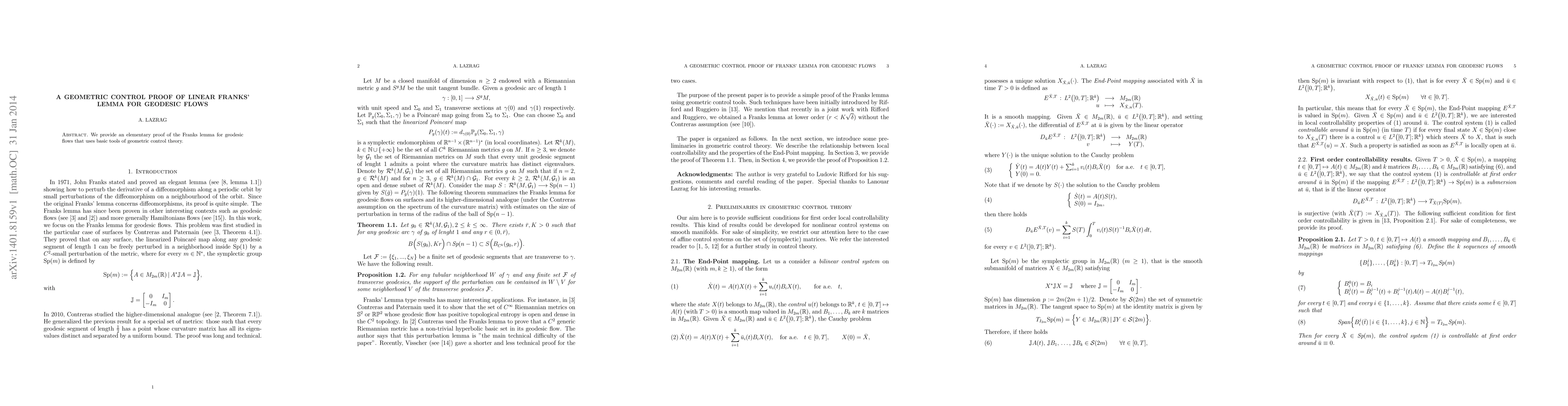 We provide an elementary proof of the Franks lemma for geodesic flows that uses basic tools of geometric control theory.