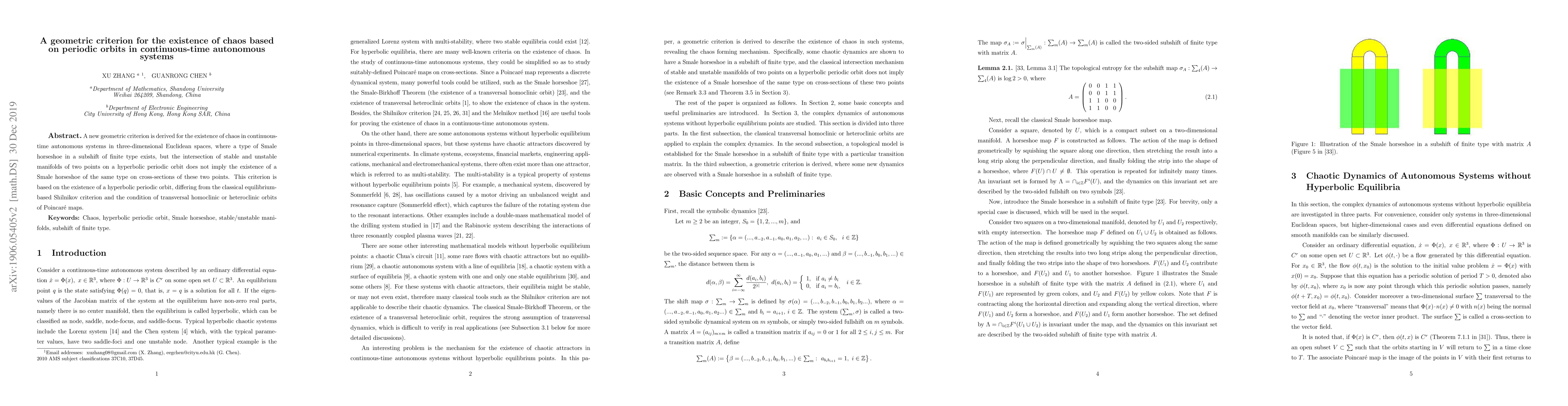 A new geometric criterion is derived for the existence of chaos in continuous-time autonomous systems in three-dimensional Euclidean spaces, where a type of Smale horseshoe in a subshift of finite type exists, but the intersection of stable and unstable manifolds of two points on a hyperbolic periodic orbit does not imply the existence of a Smale horseshoe of the same type on cross-sections of these two points. This criterion is based on the existence of a hyperbolic periodic orbit, differing from the classical equilibrium-based Shilnikov criterion and the condition of transversal homoclinic or heteroclinic orbits of Poincar\'{e} maps.