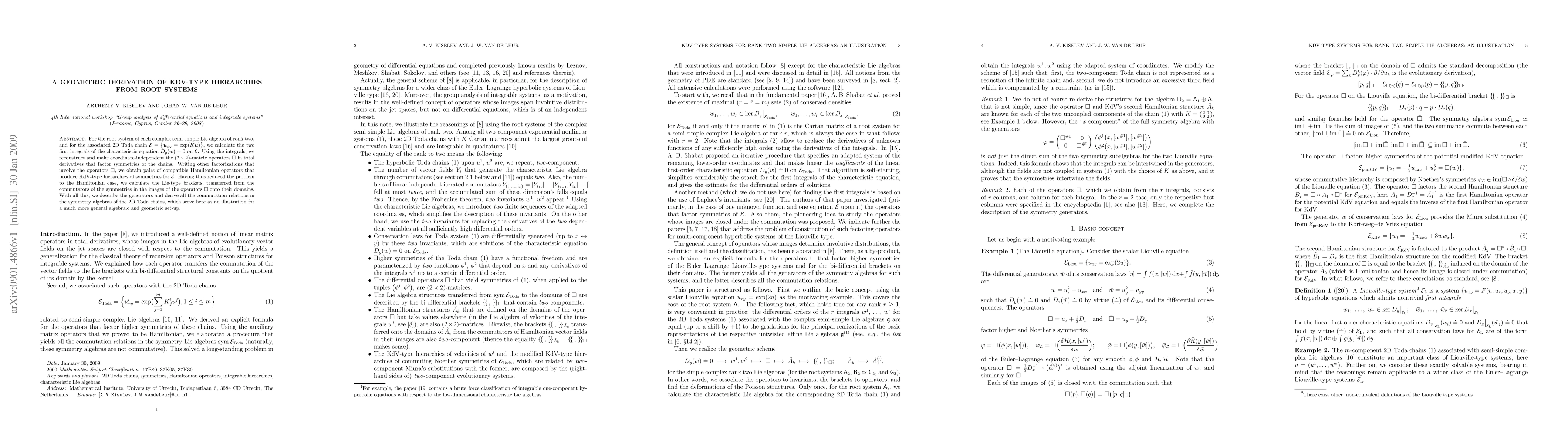 For the root system of each complex semi-simple Lie algebra of rank two, and for the associated 2D Toda chain $E=\{u_{xy}=\exp(K u)\}$, we calculate the two first integrals of the characteristic equation $D_y(w)=0$ on $E$. Using the integrals, we reconstruct and make coordinate-independent the $(2\times 2)$-matrix operators $\square$ in total derivatives that factor symmetries of the chains. Writing other factorizations that involve the operators $\square$, we obtain pairs of compatible Hamiltonian operators that produce KdV-type hierarchies of symmetries for $\cE$. Having thus reduced the problem to the Hamiltonian case, we calculate the Lie-type brackets, transferred from the commutators of the symmetries in the images of the operators $\square$ onto their domains. With all this, we describe the generators and derive all the commutation relations in the symmetry algebras of the 2D Toda chains, which serve here as an illustration for a much more general algebraic and geometric set-up.
