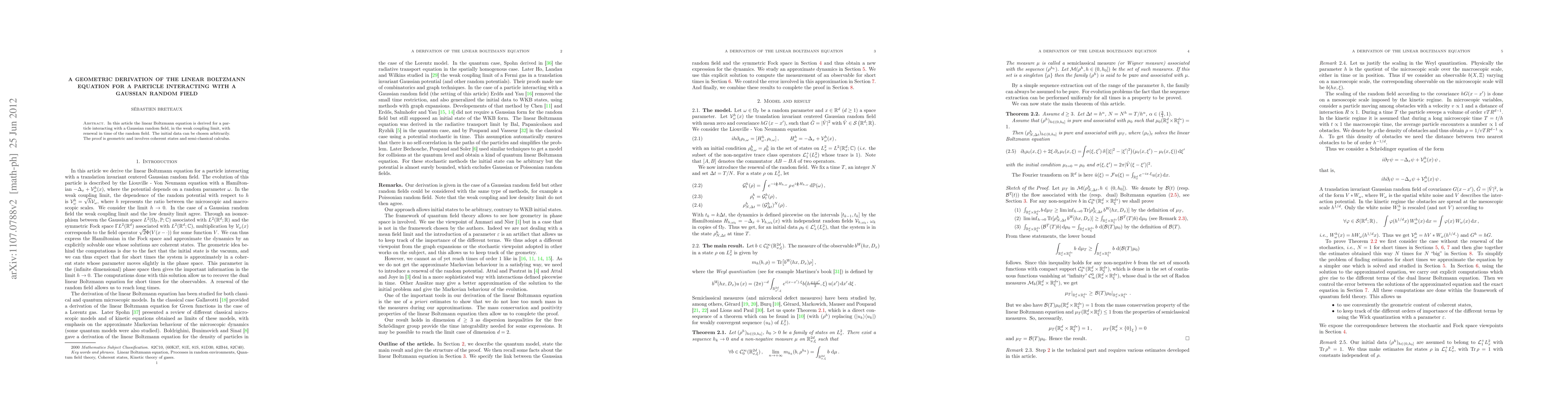 This paper geometrically derives the linear Boltzmann equation for a particle interacting with a Gaussian random field in the weak coupling limit, utilizing coherent states and semi-classical calculus to handle renewal in time of the random field. Initial data can be chosen freely.