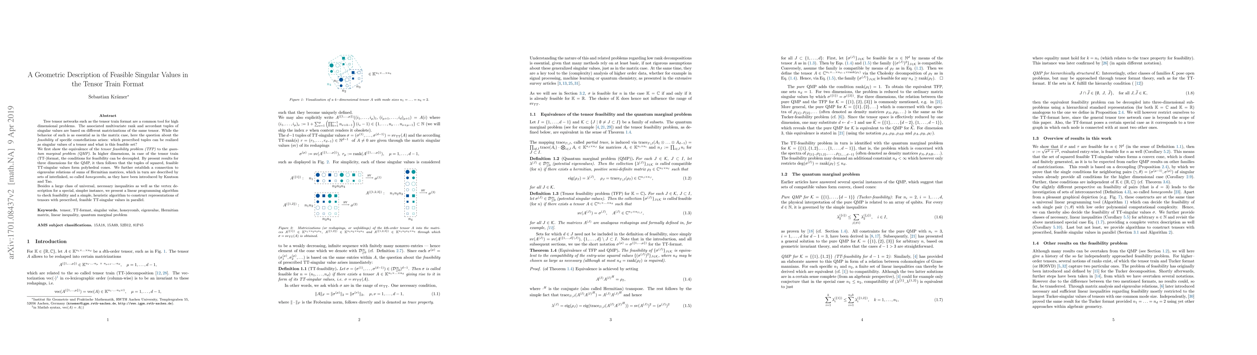 Tree tensor networks such as the tensor train format are a common tool for high dimensional problems. The associated multivariate rank and accordant tuples of singular values are based on different matricizations of the same tensor. While the behavior of such is as essential as in the matrix case, here the question about the $\textit{feasibility}$ of specific constellations arises: which prescribed tuples can be realized as singular values of a tensor and what is this feasible set? We first show the equivalence of the $\textit{tensor feasibility problem (TFP)}$ to the $\textit{quantum marginal problem (QMP)}$. In higher dimensions, in case of the tensor train (TT-)format, the conditions for feasibility can be decoupled. By present results for three dimensions for the QMP, it then follows that the tuples of squared, feasible TT-singular values form polyhedral cones. We further establish a connection to eigenvalue relations of sums of Hermitian matrices, which in turn are described by sets of interlinked, so called $\textit{honeycombs}$, as they have been introduced by Knutson and Tao. Besides a large class of universal, necessary inequalities as well as the vertex description for a special, simpler instance, we present a linear programming algorithm to check feasibility and a simple, heuristic algorithm to construct representations of tensors with prescribed, feasible TT-singular values in parallel.