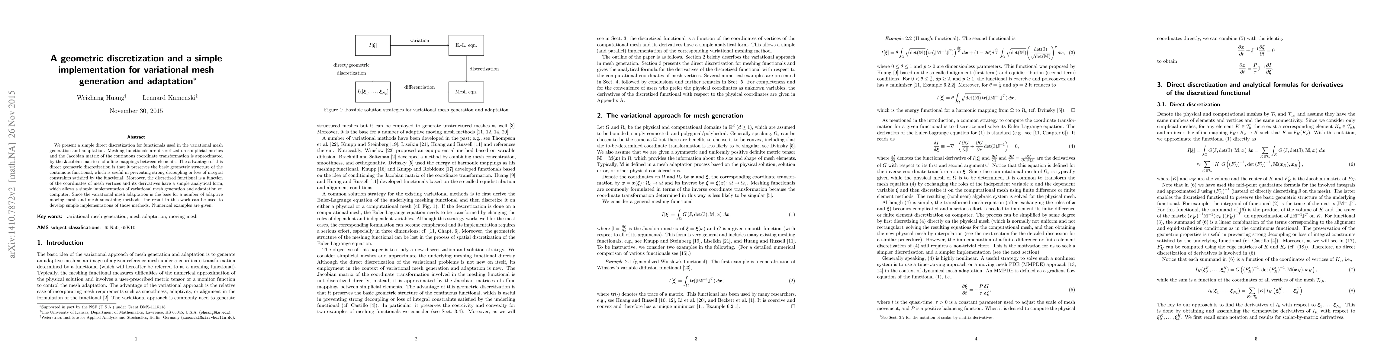 This paper introduces a straightforward geometric discretization method for variational mesh generation and adaptation, preserving the geometric structure of continuous functionals. The method simplifies implementation and supports adaptive mesh techniques, as demonstrated through numerical examples.