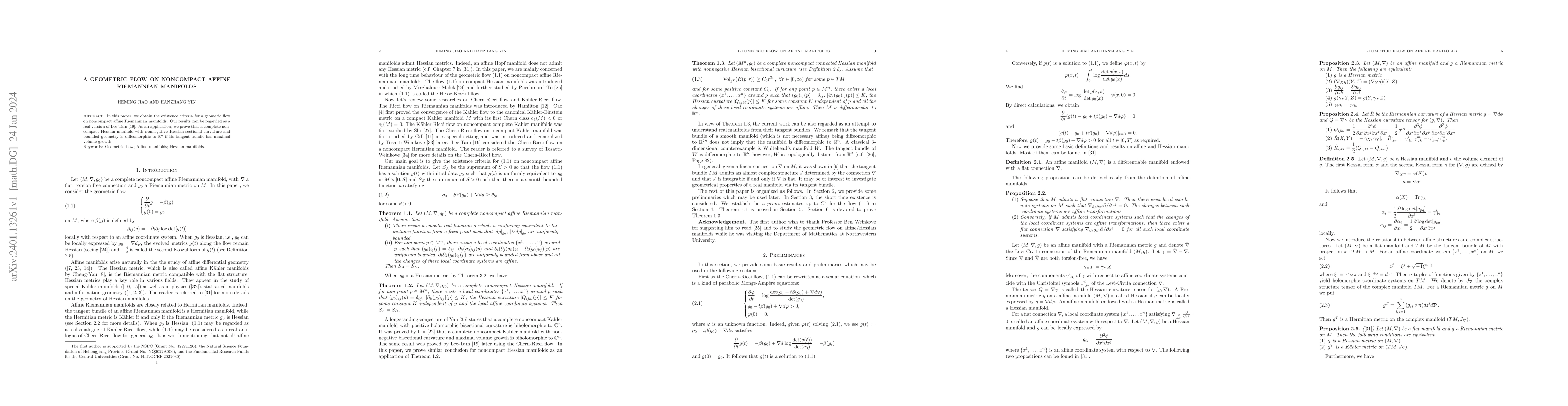 In this paper, we obtain the existence criteria for a geometic flow on noncompact affine Riemannian manifolds. Our results can be regarded as a real version of Lee-Tam [19]. As an application, we prove that a complete noncompact Hessian manifold with nonnegative Hessian sectional curvature and bounded geometry is diffeomorphic to $\mathbb{R}^n$ if its tangent bundle has maximal volume growth.