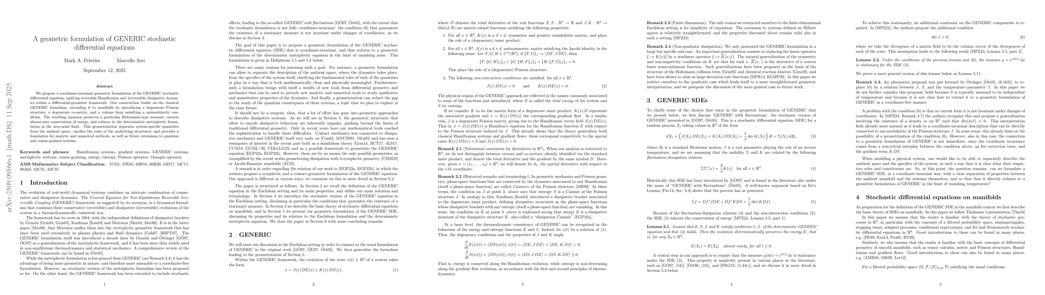 We propose a coordinate-invariant geometric formulation of the GENERIC stochastic differential equation, unifying reversible Hamiltonian and irreversible dissipative dynamics within a differential-geometric framework. Our construction builds on the classical GENERIC formalism, extending it to manifolds by introducing a degenerate Poisson structure, a degenerate co-metric, and a volume form satisfying a unimodularity condition. The resulting equation preserves a particular Boltzmann-type measure, ensures almost-sure conservation of energy, and reduces to the deterministic metriplectic formulation in the zero-noise limit. This geometrization separates system-specific quantities from the ambient space, clarifies the roles of the underlying structures, and provides a foundation for analytic and numerical methods, as well as future extensions to quantum and coarse-grained systems.