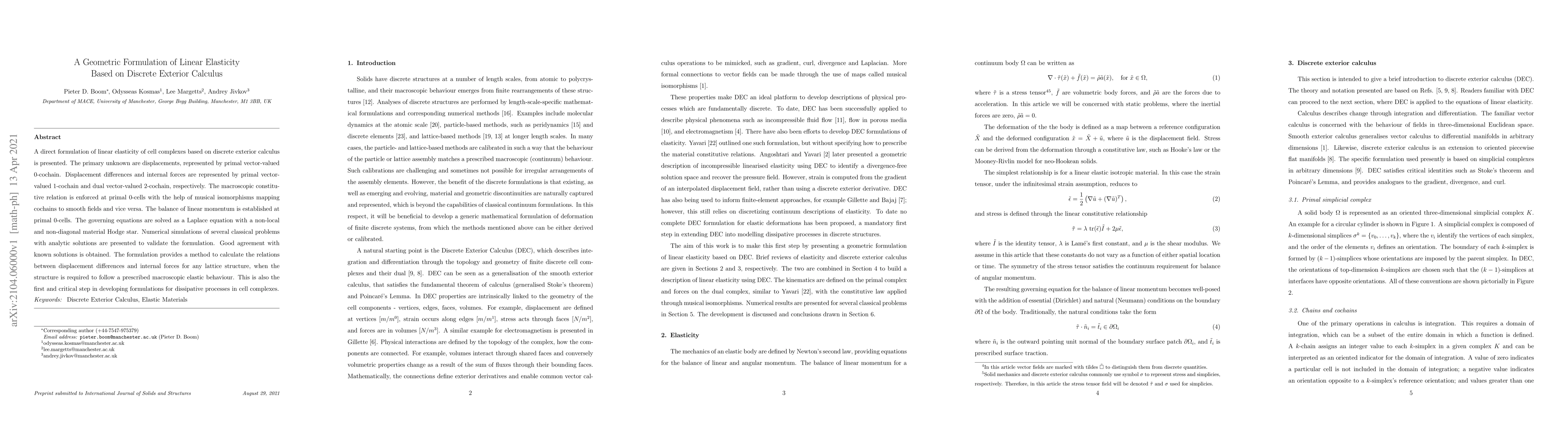 This paper presents a novel geometric formulation of linear elasticity using discrete exterior calculus on cell complexes, representing displacements and internal forces as cochains. Numerical simulations validate the approach, demonstrating its potential for modeling lattice structures with prescribed macroscopic elastic behavior.
