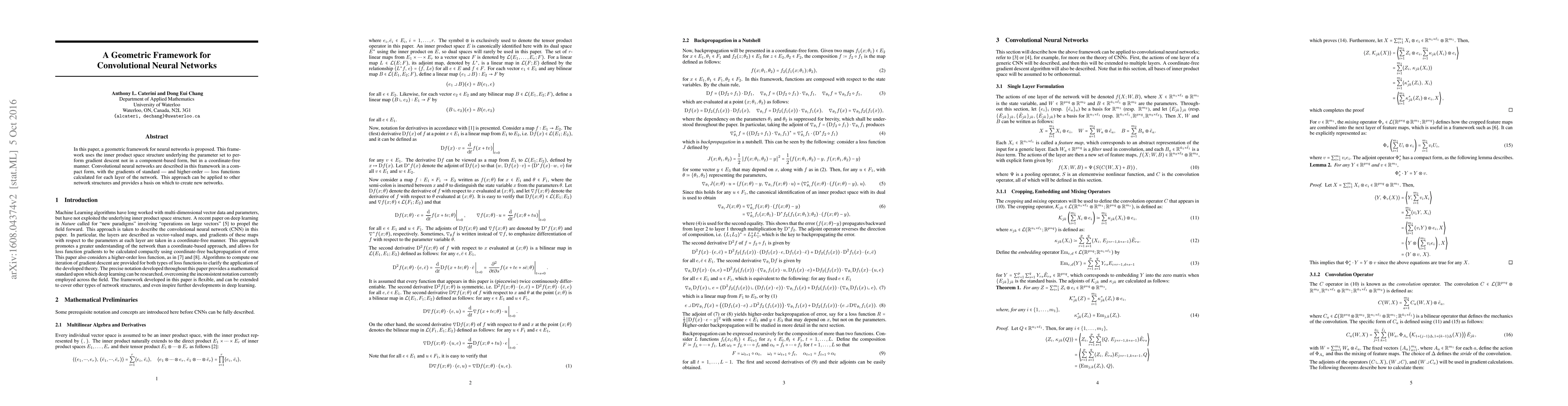 In this paper, a geometric framework for neural networks is proposed. This framework uses the inner product space structure underlying the parameter set to perform gradient descent not in a component-based form, but in a coordinate-free manner. Convolutional neural networks are described in this framework in a compact form, with the gradients of standard --- and higher-order --- loss functions calculated for each layer of the network. This approach can be applied to other network structures and provides a basis on which to create new networks.