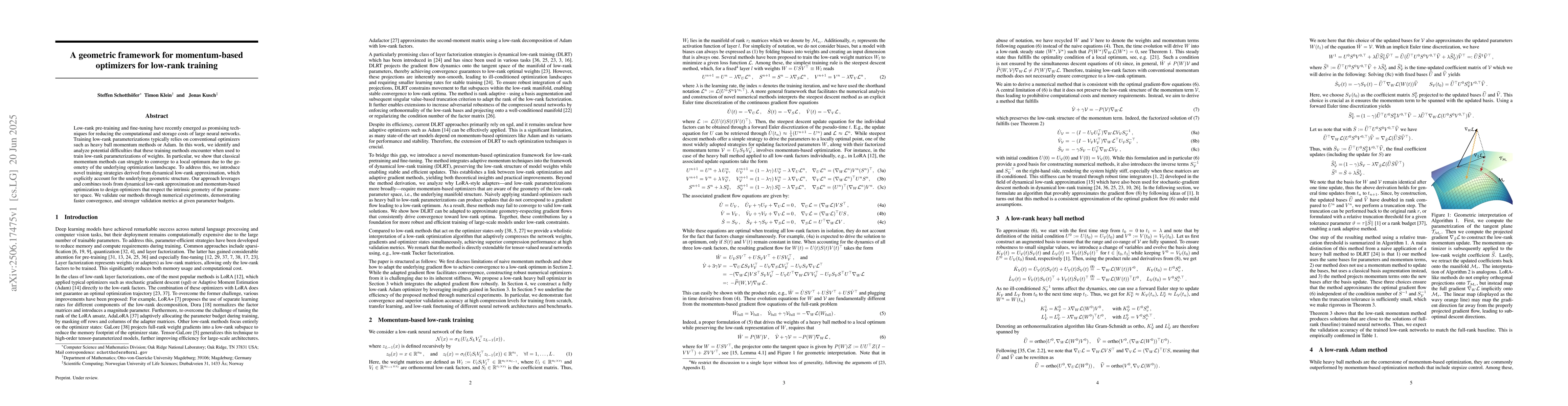 This research introduces a geometric framework for momentum-based optimizers to improve low-rank training in neural networks, addressing convergence issues in classical methods. The proposed strategies, derived from dynamical low-rank approximation, show faster convergence and better validation metrics in experiments.