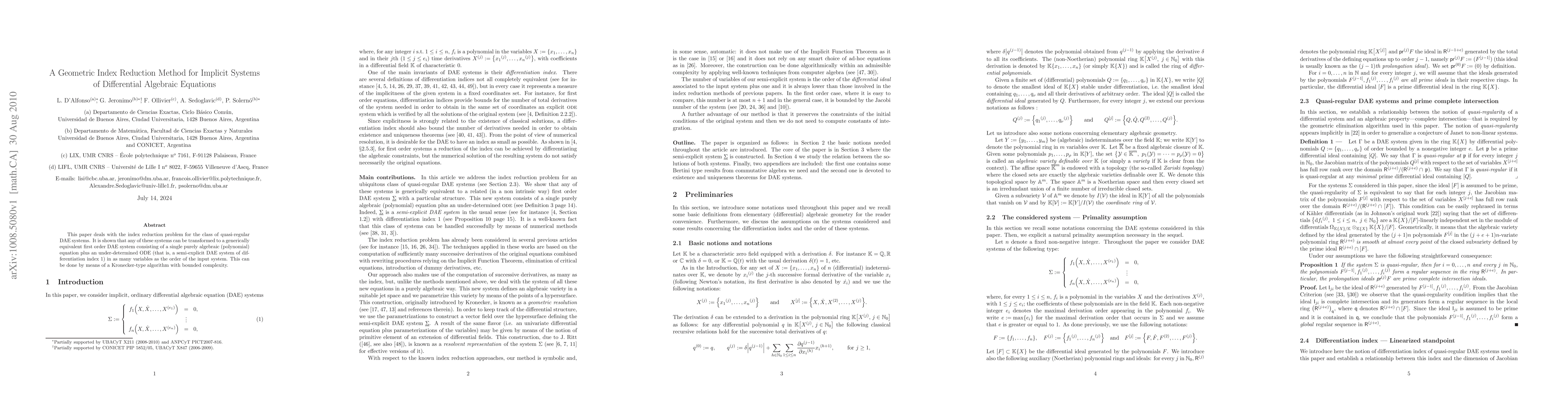 This paper deals with the index reduction problem for the class of quasi-regular DAE systems. It is shown that any of these systems can be transformed to a generically equivalent first order DAE system consisting of a single purely algebraic (polynomial) equation plus an under-determined ODE (that is, a semi-explicit DAE system of differentiation index 1) in as many variables as the order of the input system. This can be done by means of a Kronecker-type algorithm with bounded complexity.