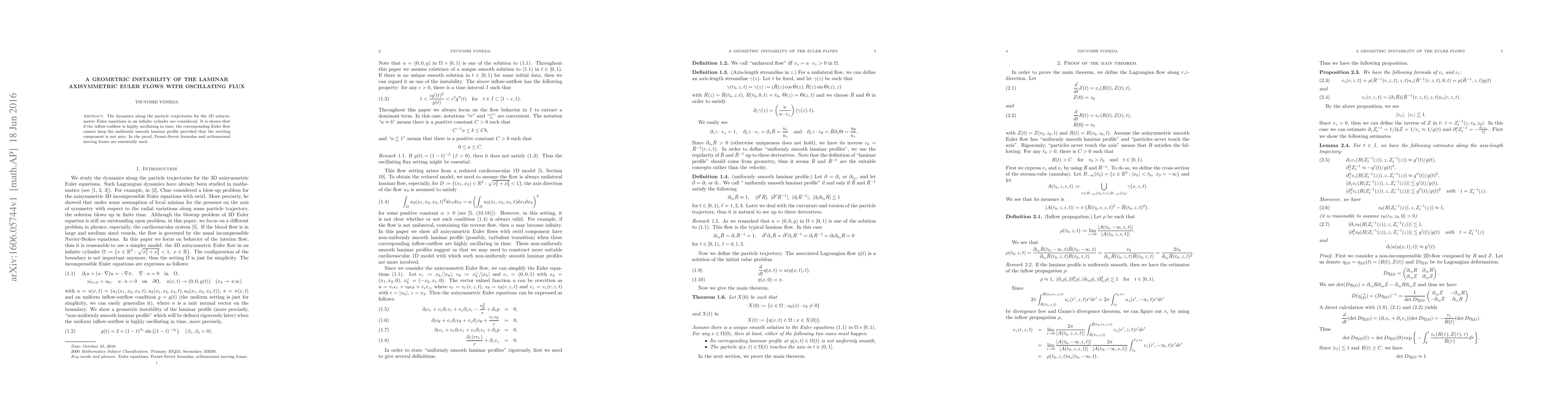 Summary: This paper demonstrates that highly oscillating inflow-outflow in 3D axisymmetric Euler flows within an infinite cylinder destabilizes uniformly smooth laminar profiles, especially when a swirling component exists, using Frenet-Serret formulas and orthonormal moving frames in the proof.