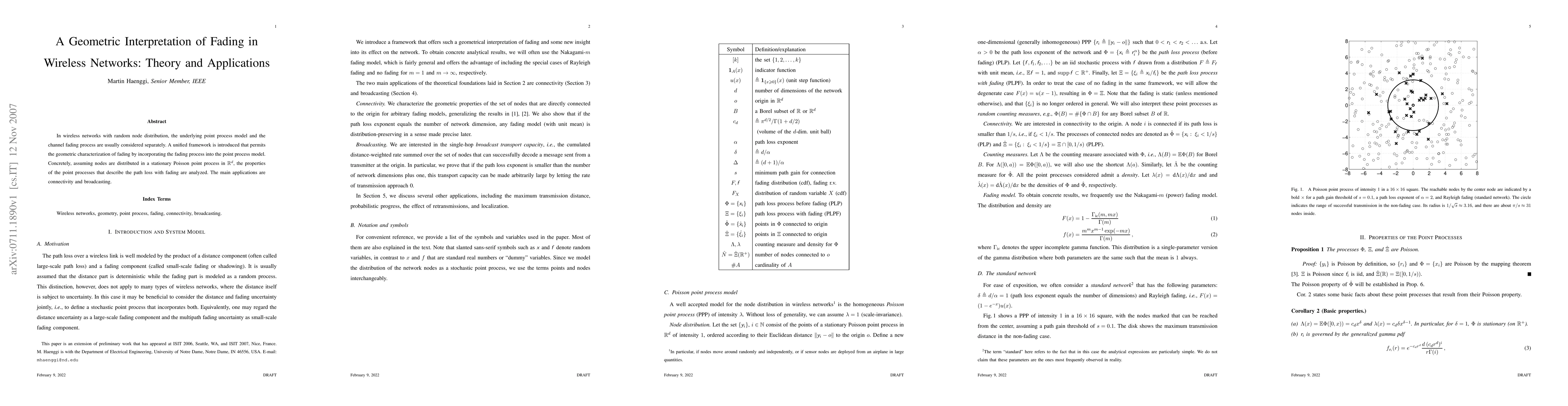 This paper presents a unified framework for analyzing fading in wireless networks by integrating the fading process into the point process model. It focuses on stationary Poisson point processes and examines their properties for path loss with fading, with applications to connectivity and broadcasting.