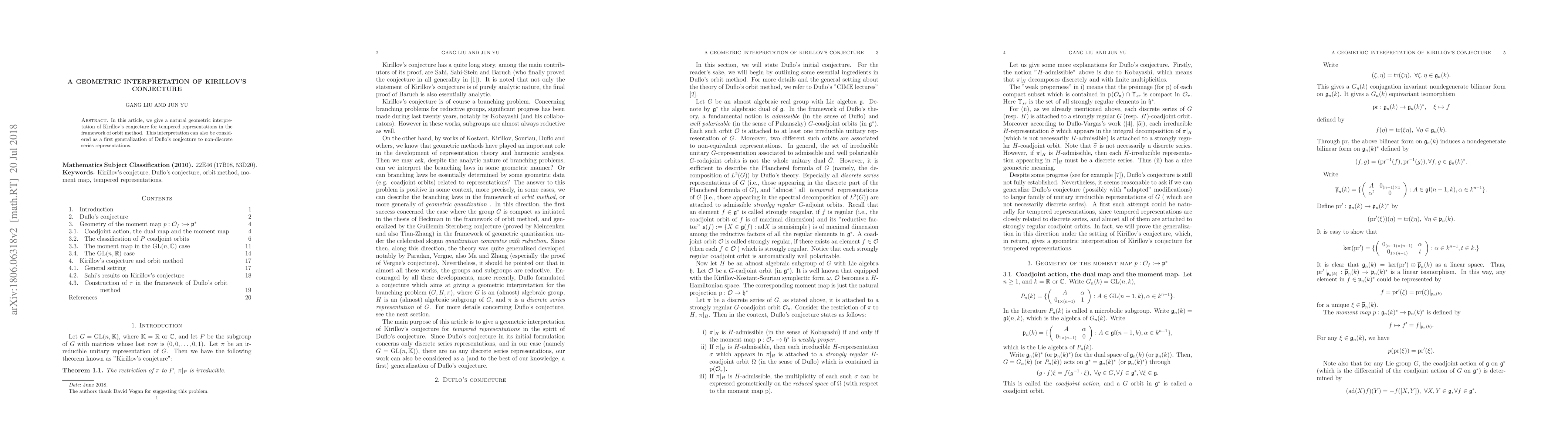 Summary: This paper provides a geometric interpretation of Kirillov's conjecture for tempered representations within the orbit method, and extends Duflo's conjecture to non-discrete series representations.