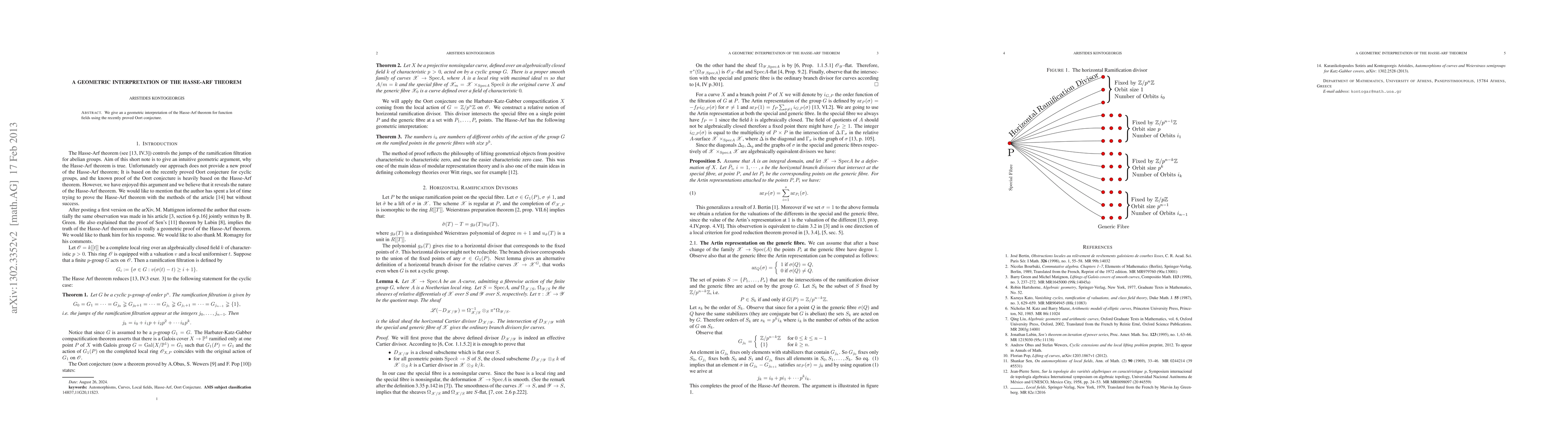 Summary: This paper provides a geometric interpretation of the Hasse-Arf theorem for function fields, leveraging the recently proven Oort conjecture to elucidate the theorem's implications. The work bridges algebraic number theory with geometric methods.