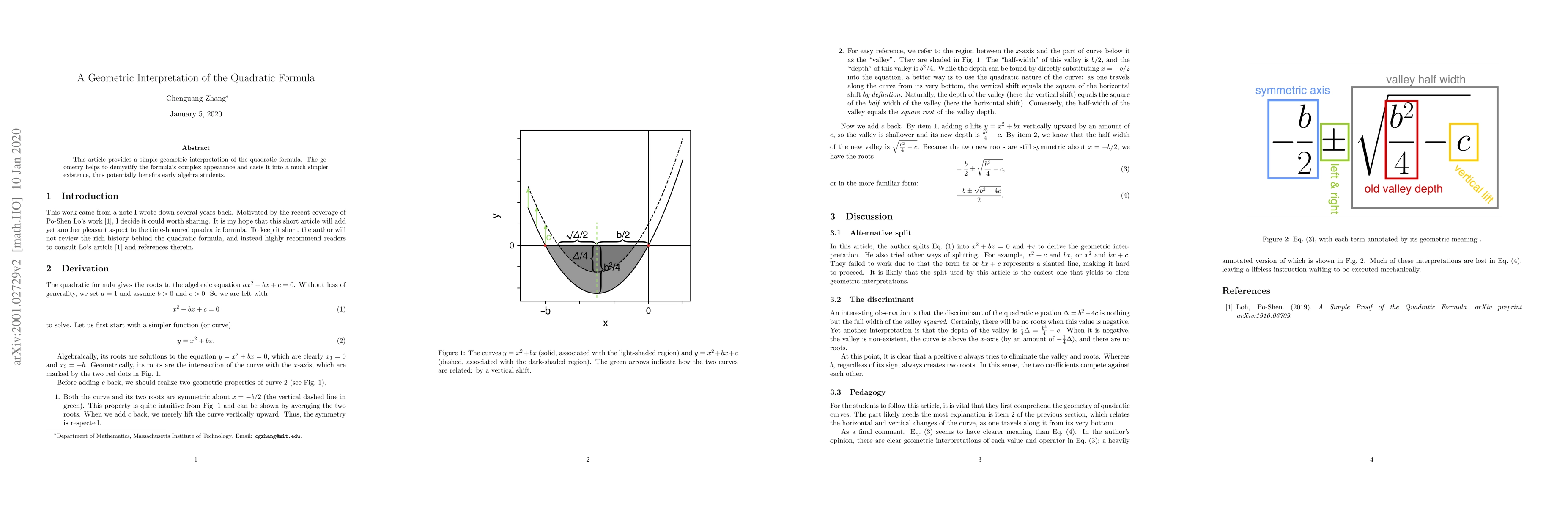 This article provides a simple geometric interpretation of the quadratic formula. The geometry helps to demystify the formula's complex appearance and casts it into a much simpler existence, thus potentially benefits early algebra students.