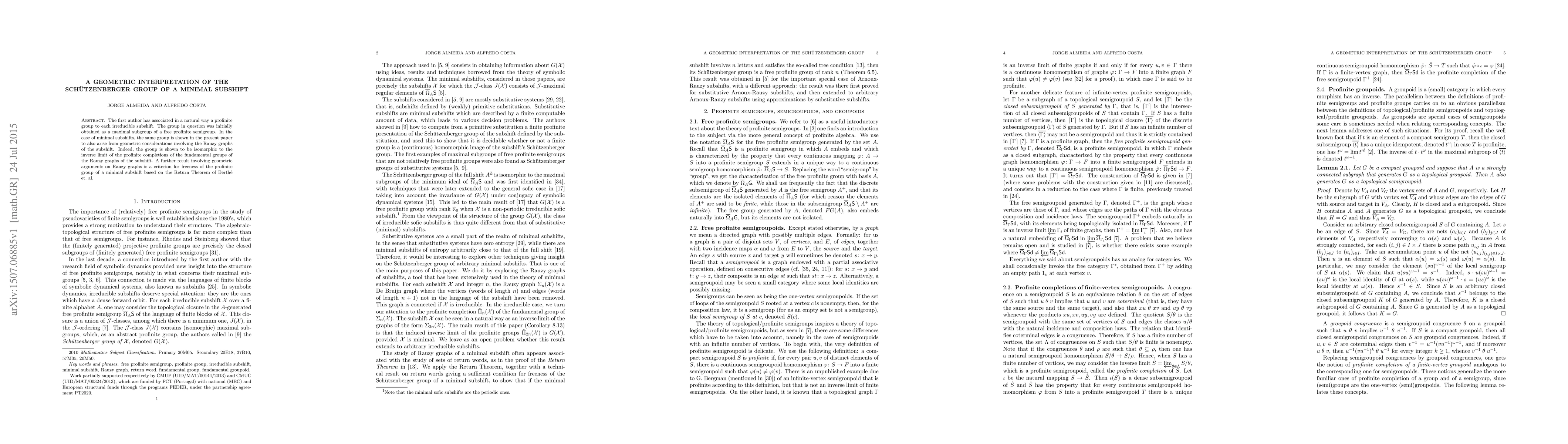 The first author has associated in a natural way a profinite group to each irreducible subshift. The group in question was initially obtained as a maximal subgroup of a free profinite semigroup. In the case of minimal subshifts, the same group is shown in the present paper to also arise from geometric considerations involving the Rauzy graphs of the subshift. Indeed, the group is shown to be isomorphic to the inverse limit of the profinite completions of the fundamental groups of the Rauzy graphs of the subshift. A further result involving geometric arguments on Rauzy graphs is a criterion for freeness of the profinite group of a minimal subshift based on the Return Theorem of Berth\'e et. al.