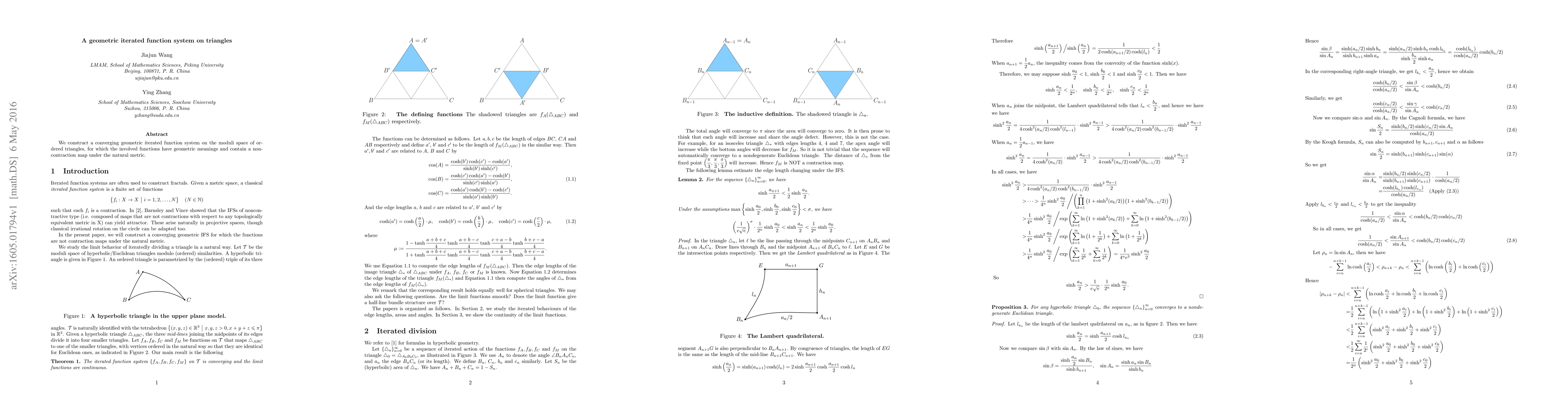 We construct a converging geometric iterated function system on the moduli space of ordered triangles, for which the involved functions have geometric meanings and contain a non-contraction map under the natural metric.
