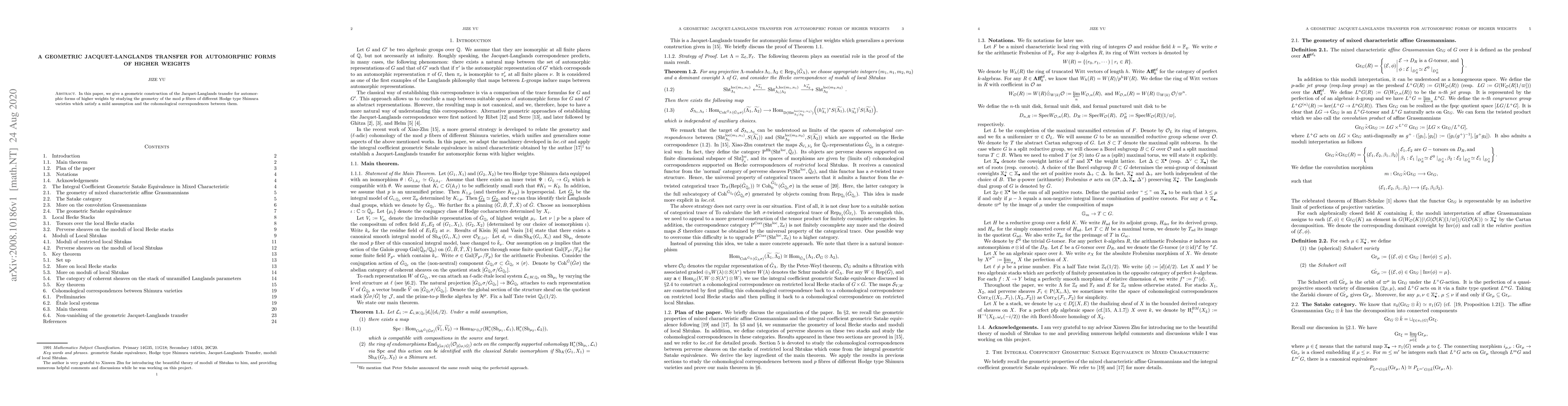 In this paper, we give a geometric construction of the Jacquet-Langlands transfer for automorphic forms of higher weights by studying the geometry of the mod $p$ fibres of different Hodge type Shimura varieties which satisfy a mild assumption and the cohomological correspondences between them.