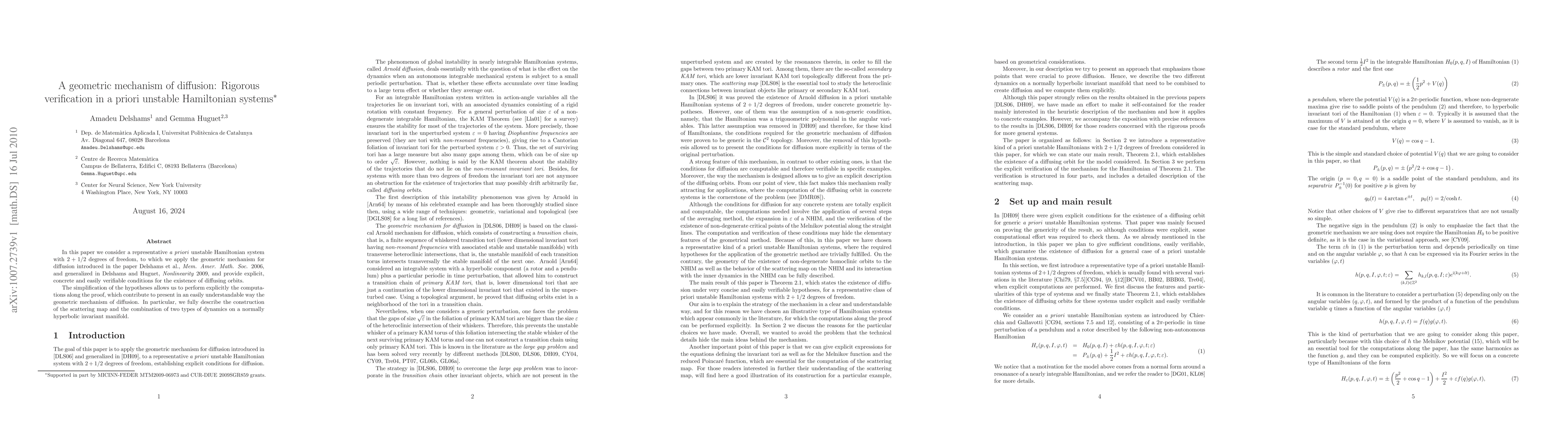 This paper rigorously verifies the geometric mechanism of diffusion in a specific a priori unstable Hamiltonian system with 2+1/2 degrees of freedom, providing explicit conditions for diffusing orbits and simplifying the hypotheses to facilitate clear understanding of the mechanism. The study includes detailed construction of the scattering map and dynamics on a normally hyperbolic invariant manifold.