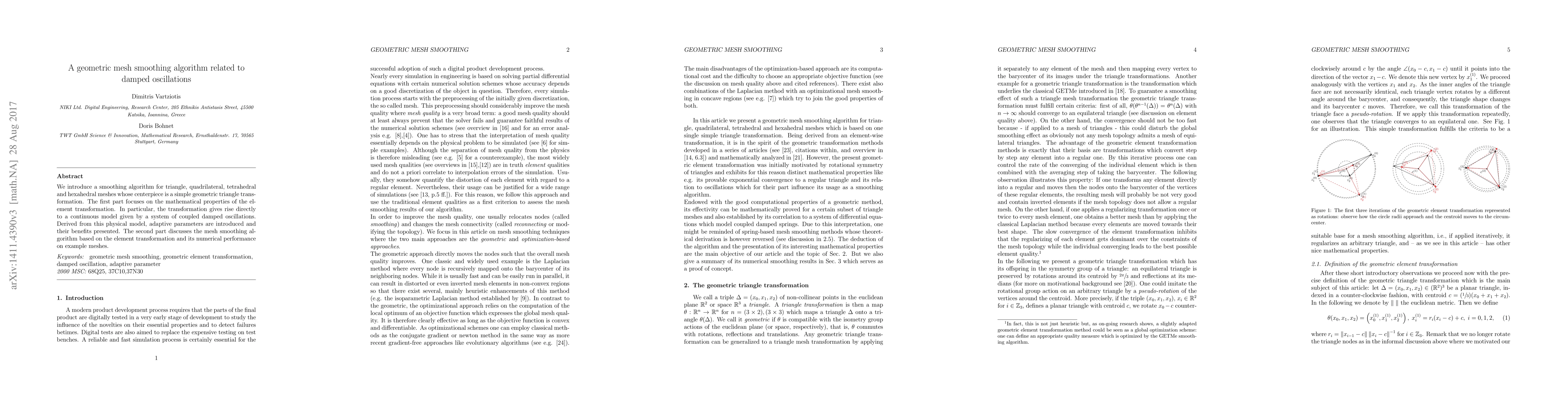 This paper presents a geometric mesh smoothing algorithm based on a triangle transformation, which models damped oscillations. It introduces adaptive parameters derived from a continuous system of coupled damped oscillations, demonstrating the algorithm's effectiveness through numerical performance on various mesh types.