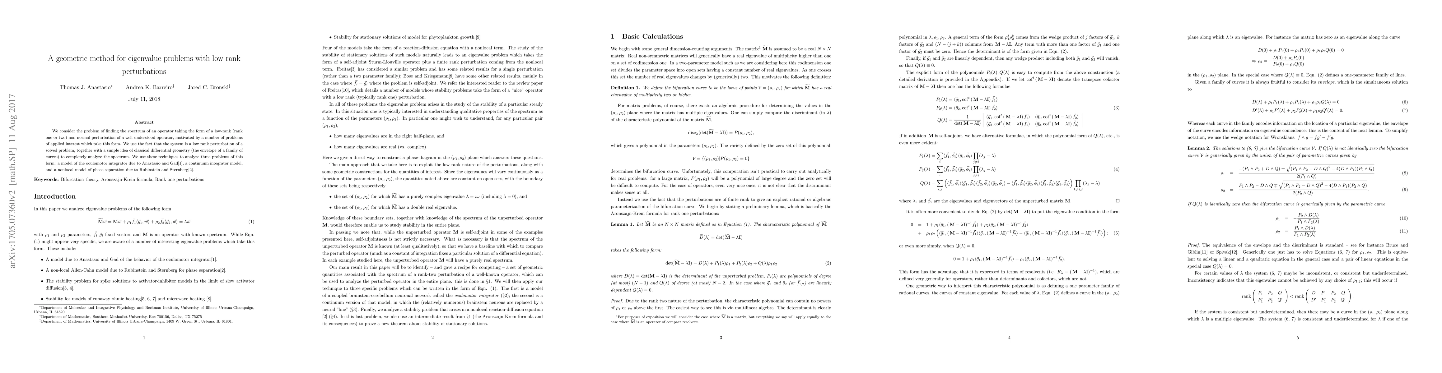 We consider the problem of finding the spectrum of an operator taking the form of a low-rank (rank one or two) non-normal perturbation of a well-understood operator, motivated by a number of problems of applied interest which take this form. We use the fact that the system is a low rank perturbation of a solved problem, together with a simple idea of classical differential geometry (the envelope of a family of curves) to completely analyze the spectrum. We use these techniques to analyze three problems of this form: a model of the oculomotor integrator due to Anastasio and Gad (2007), a continuum integrator model, and a nonlocal model of phase separation due to Rubinstein and Sternberg (1992).