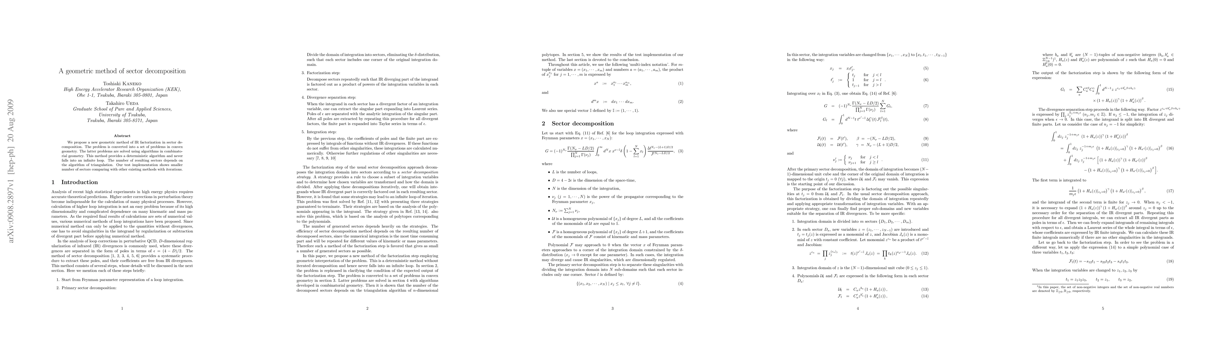 The paper introduces a novel geometric method for Infrared (IR) factorization in sector decomposition, transforming the problem into convex geometry issues solved via combinatorial geometry algorithms. This deterministic approach avoids infinite loops, and its implementation shows fewer sectors than existing methods, with sector count dependent on triangulation algorithm used.
