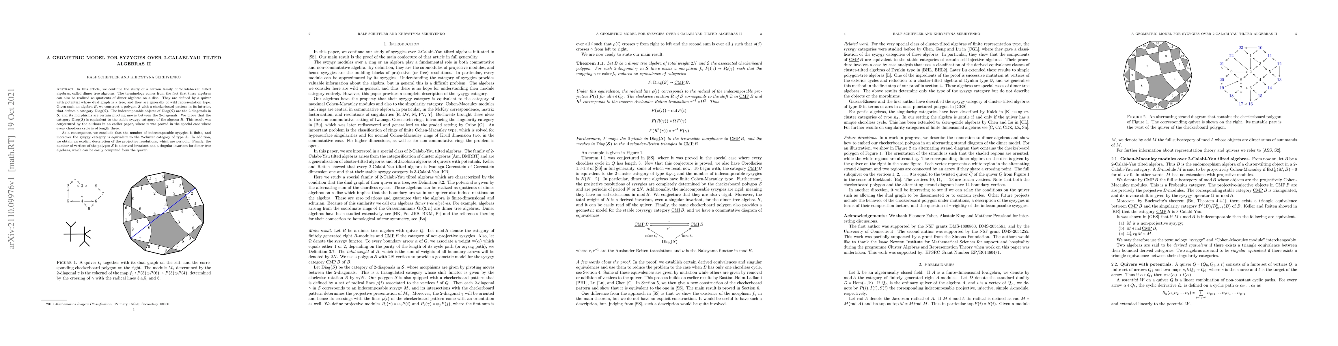In this article, we continue the study of a certain family of 2-Calabi-Yau tilted algebras, called dimer tree algebras. The terminology comes from the fact that these algebras can also be realized as quotients of dimer algebras on a disc. They are defined by a quiver with potential whose dual graph is a tree, and they are generally of wild representation type. Given such an algebra $B$, we construct a polygon $\mathcal{S}$ with a checkerboard pattern in its interior, that defines a category $\text{Diag}(\mathcal{S})$. The indecomposable objects of $\text{Diag}(\mathcal{S})$ are the 2-diagonals in $\mathcal{S}$, and its morphisms are certain pivoting moves between the 2-diagonals. We prove that the category $\text{Diag}(\mathcal{S})$ is equivalent to the stable syzygy category of the algebra $B$. This result was conjectured by the authors in an earlier paper, where it was proved in the special case where every chordless cycle is of length three. As a consequence, we conclude that the number of indecomposable syzygies is finite, and moreover the syzygy category is equivalent to the 2-cluster category of type $\mathbb{A}$. In addition, we obtain an explicit description of the projective resolutions, which are periodic. Finally, the number of vertices of the polygon $\mathcal{S}$ is a derived invariant and a singular invariant for dimer tree algebras, which can be easily computed form the quiver.