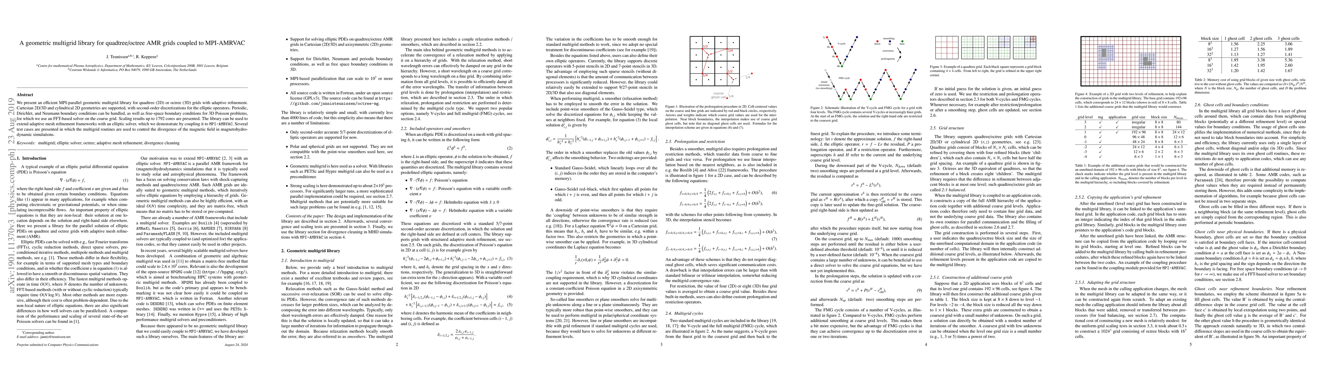This paper introduces a parallel geometric multigrid library for quadtree/octree adaptive mesh refinement grids, supporting Cartesian and cylindrical geometries, and coupled to MPI-AMRVAC. The library efficiently handles various boundary conditions and scales up to 1792 cores, demonstrating its use in magnetohydrodynamic simulations.