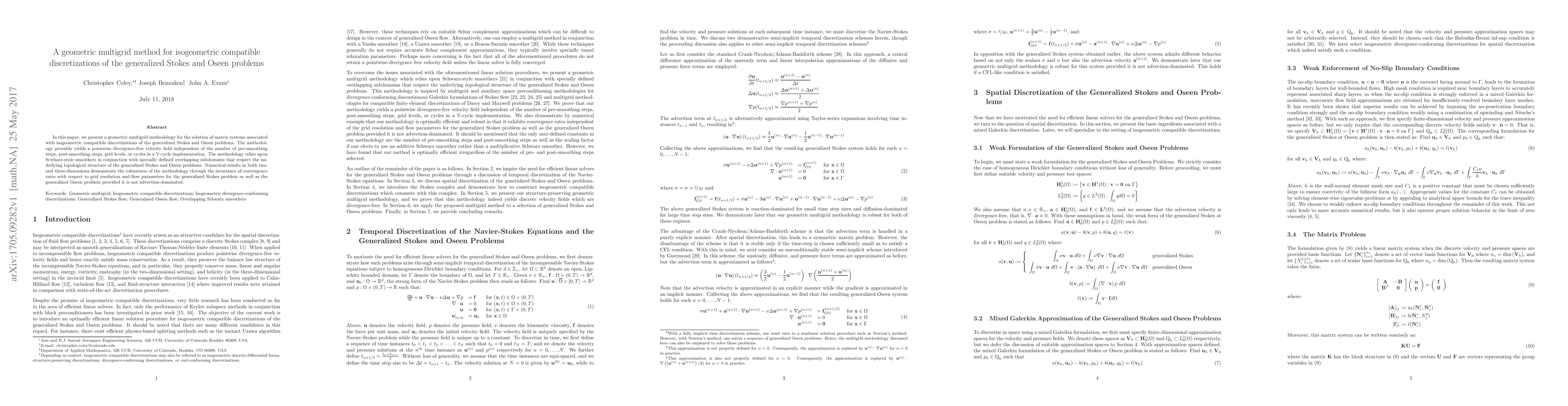 This paper introduces a geometric multigrid method for solving matrix systems from isogeometric discretizations of the generalized Stokes and Oseen problems, ensuring a divergence-free velocity field and robust convergence rates independent of grid levels and smoothing steps. Numerical results show consistent convergence across different dimensions and flow parameters.