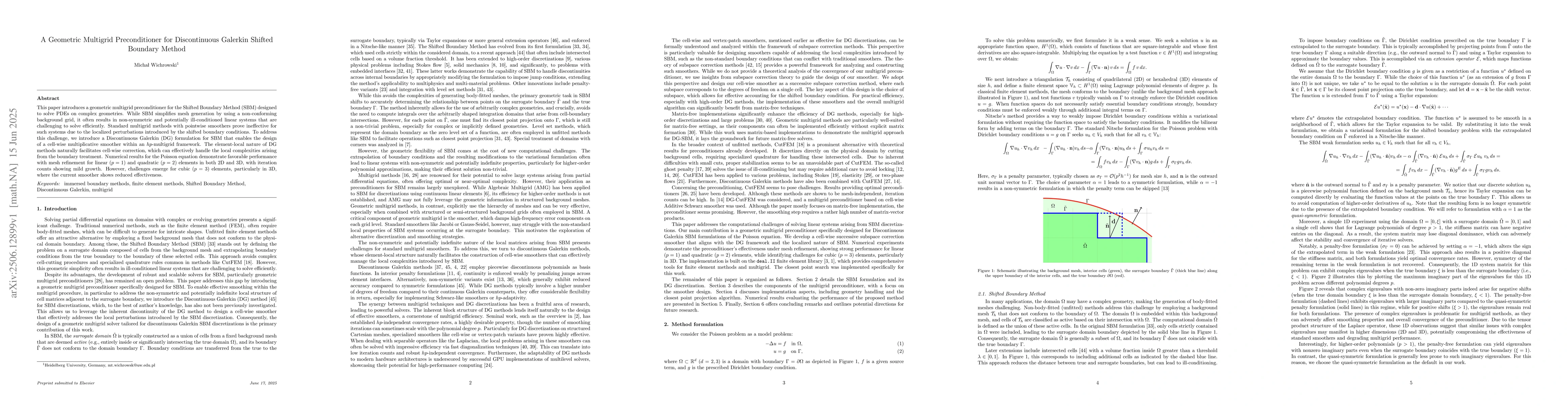 This paper introduces a geometric multigrid preconditioner for the Shifted Boundary Method (SBM) designed to solve PDEs on complex geometries. While SBM simplifies mesh generation by using a non-conforming background grid, it often results in non-symmetric and potentially ill-conditioned linear systems that are challenging to solve efficiently. Standard multigrid methods with pointwise smoothers prove ineffective for such systems due to the localized perturbations introduced by the shifted boundary conditions. To address this challenge, we introduce a Discontinuous Galerkin (DG) formulation for SBM that enables the design of a cell-wise multiplicative smoother within an $hp$-multigrid framework. The element-local nature of DG methods naturally facilitates cell-wise correction, which can effectively handle the local complexities arising from the boundary treatment. Numerical results for the Poisson equation demonstrate favorable performance with mesh refinement for linear ($p=1$) and quadratic ($p=2$) elements in both 2D and 3D, with iteration counts showing mild growth. However, challenges emerge for cubic ($p=3$) elements, particularly in 3D, where the current smoother shows reduced effectiveness.