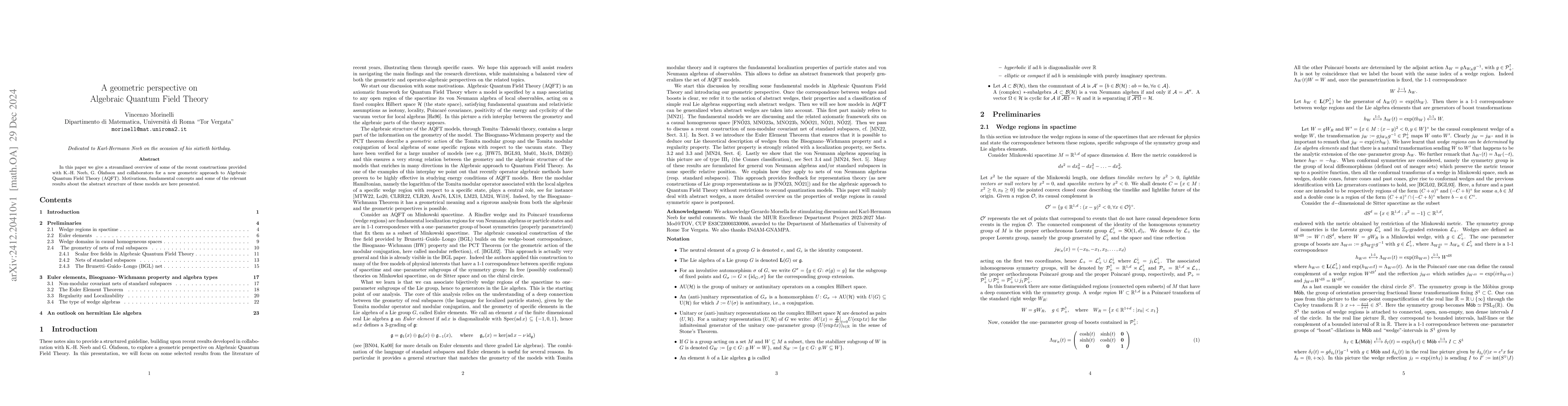 This paper presents a geometric perspective on Algebraic Quantum Field Theory (AQFT) and reviews recent constructions by Neeb, Óláfsson, and collaborators, focusing on motivations, fundamental concepts, and the abstract structural results of these models.